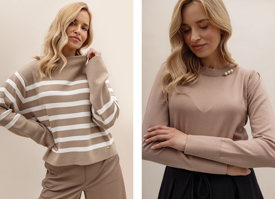 Trudno sobie wyobrazić garderobę bez ciepłych swetrów. To właśnie one sprawiają, że stylizacja jest praktyczna. W biurze świetnie sprawdzi się klasyczny, prosty sweter, który będzie idealnym wyborem pod marynarkę, natomiast długi kardigan pozwoli Ci poczuć się swobodnie w mniej formalnym środowisku.