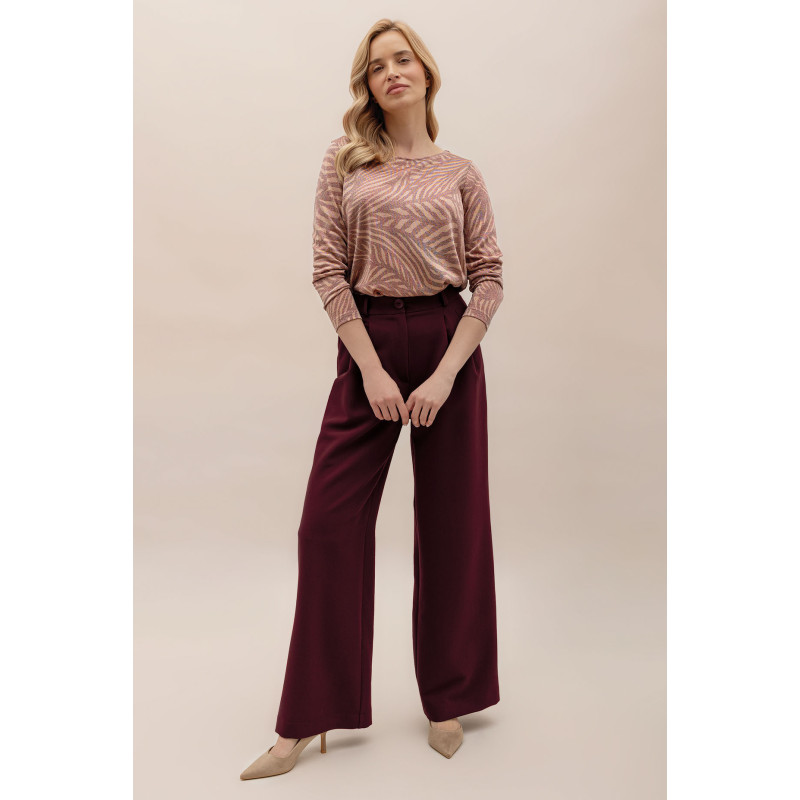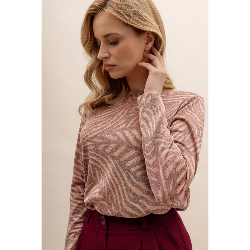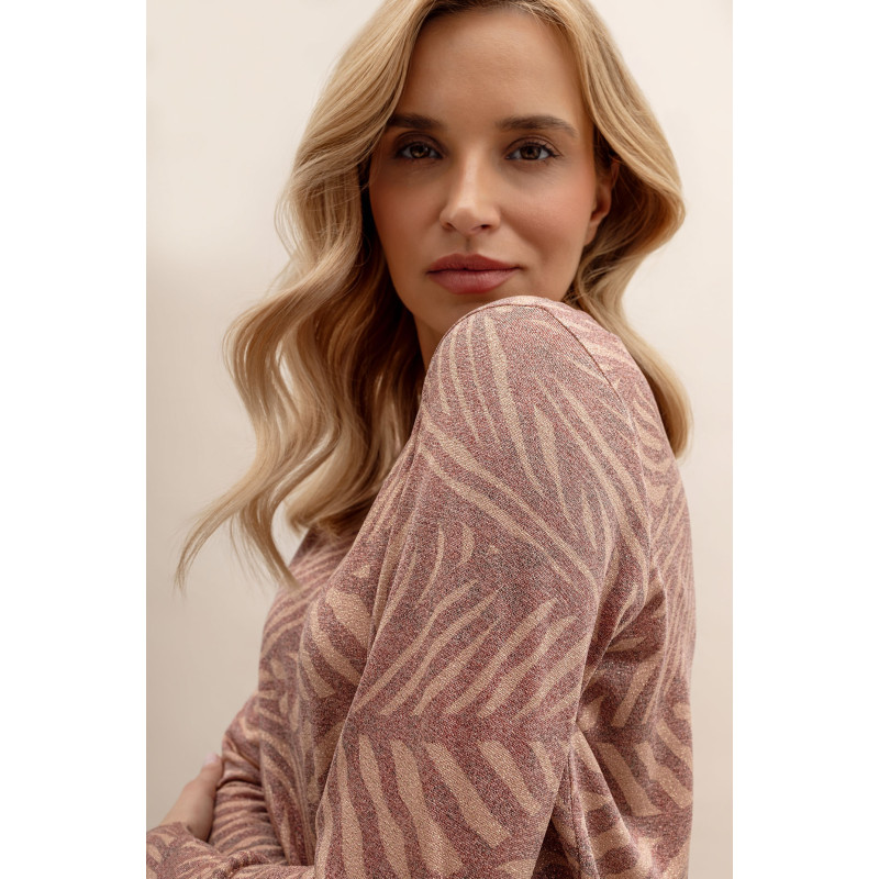 Luźniejszy fason zapewnia swobodę ruchów i komfort noszenia, niezależnie od sylwetki. To idealna propozycja dla kobiet ceniących styl i wygodę jednocześnie. Długi rękaw sprawia, że bluzka świetnie sprawdzi się zarówno w chłodniejsze dni, jak i w sezonie przejściowym. Stonowany kolor brudnego różu w połączeniu z subtelnym wzorem dodaje całości wyjątkowej elegancji i lekkości.