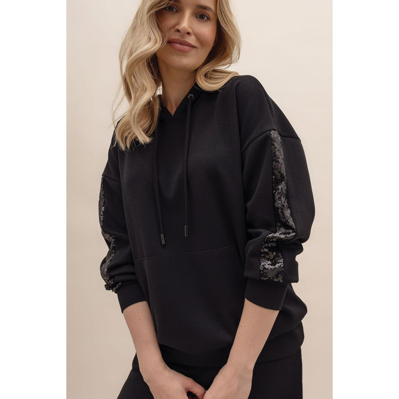 Model wyróżniają efektowne wstawki z cekinów na rękawach, które dodają całości wyjątkowego, kobiecego blasku i czynią z bluzy niebanalny element garderoby. Z przodu znajduje się duża, praktyczna kieszeń, idealna do ogrzania dłoni lub schowania drobiazgów.