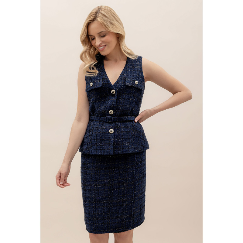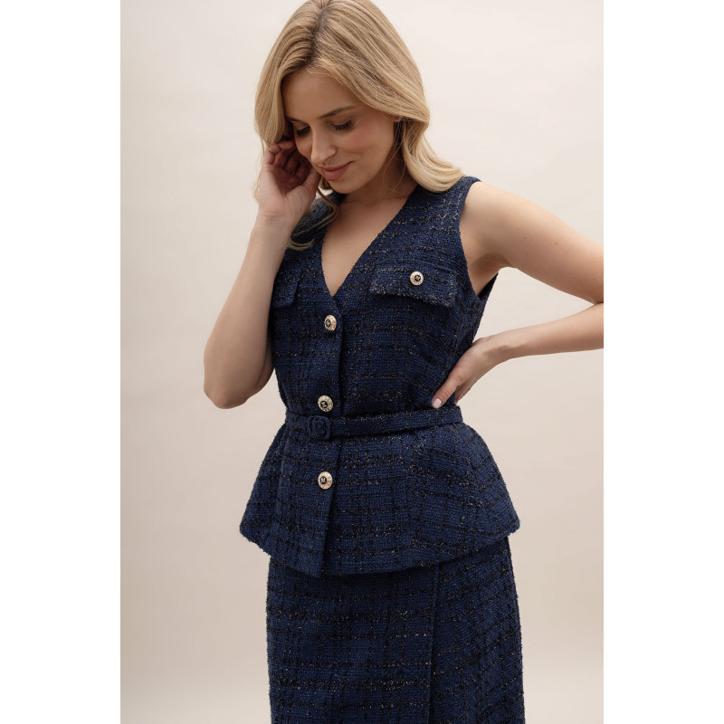 Dopasowany fason bez rękawów pięknie podkreśla kobiecą sylwetkę, a ozdobne, złote guziki z przodu stanowią efektowny akcent, który przyciąga wzrok. Kamizelka posiada imitacje kieszeni z klapami, które podkreślają formalny styl całości. W komplecie znajduje się pasek z tej samej tkaniny, dzięki któremu można dodatkowo zaakcentować talię i nadać stylizacji indywidualny charakter.