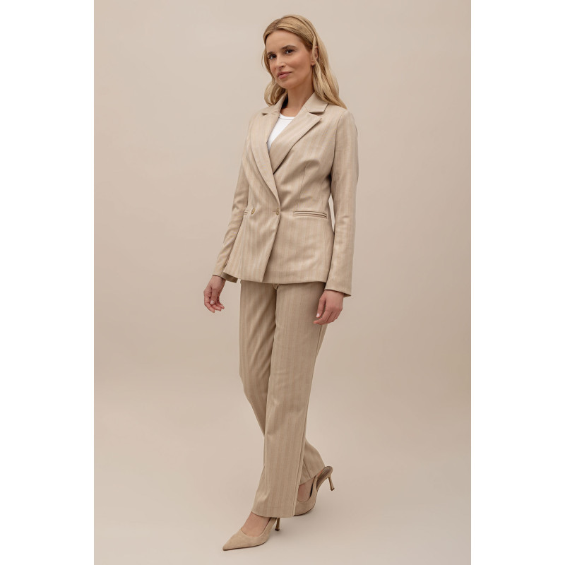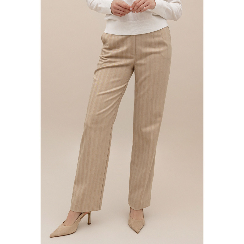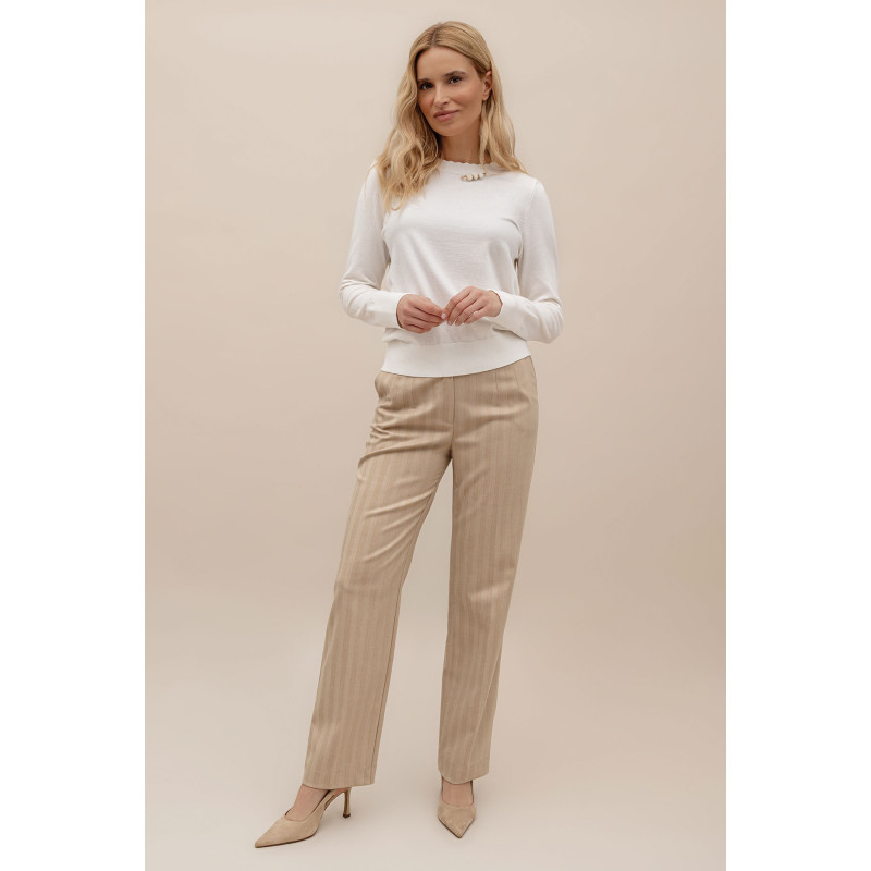 Spodnie zostały uszyte z tkaniny o delikatnej strukturze, z subtelnym dodatkiem złotej nitki, która nadaje im szlachetnego, lekko połyskującego wykończenia. Dzięki temu model zyskuje wyjątkowy charakter, idealny zarówno do pracy, jak i na specjalne okazje.