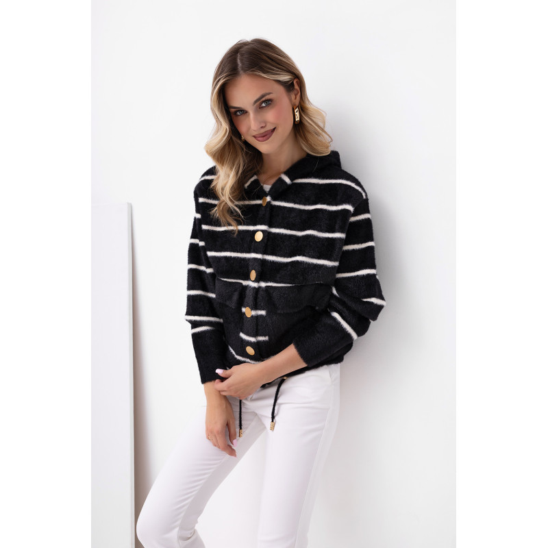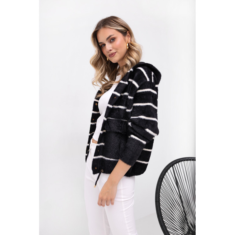 Stylowy, czarny sweter damski w paski to idealny wybór na chłodniejsze dni, łączący wygodę z modnym designem. Wykonany z miękkiego, przyjemnego w dotyku materiału, zapewnia komfort noszenia przez cały dzień.