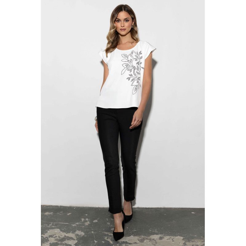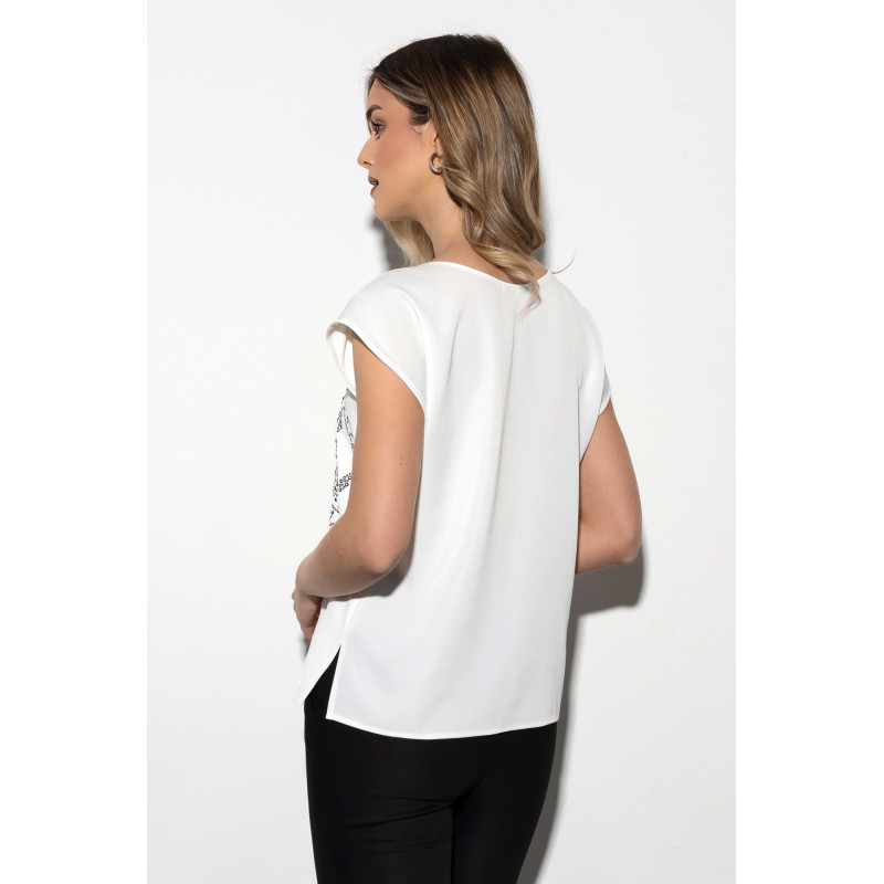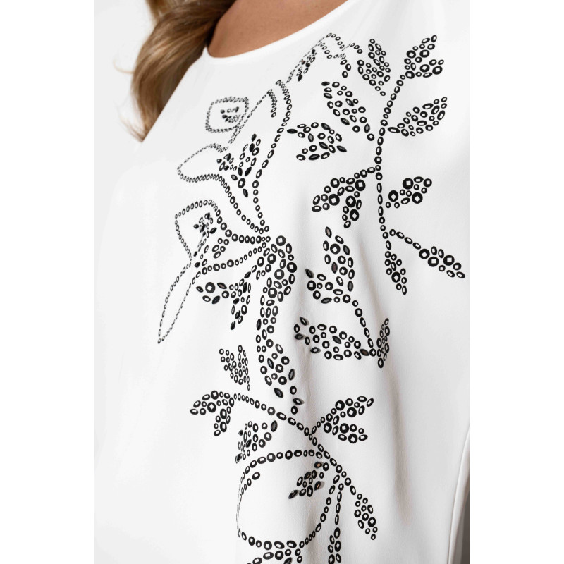 Bluzka ma luźniejszy fason z rozcięciami na dole po bokach, co zwiększa swobodę ruchów i nadaje jej nowoczesnego charakteru. Subtelnie układa się na sylwetce, maskując drobne niedoskonałości. Z przodu zdobi ją ozdobny, czarny nadruk z aplikacją z dżetami, który dodaje bluzce elegancji i wyjątkowego blasku. To idealny detal dla kobiet, które cenią subtelne, ale efektowne akcenty w codziennych stylizacjach.