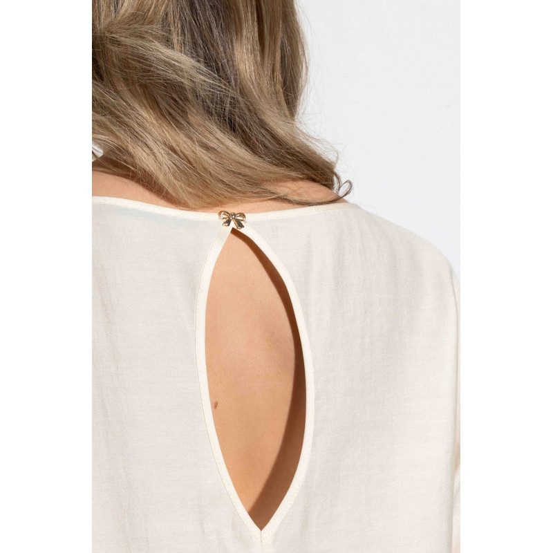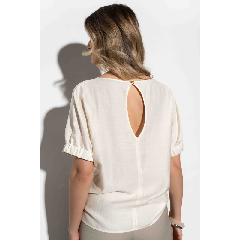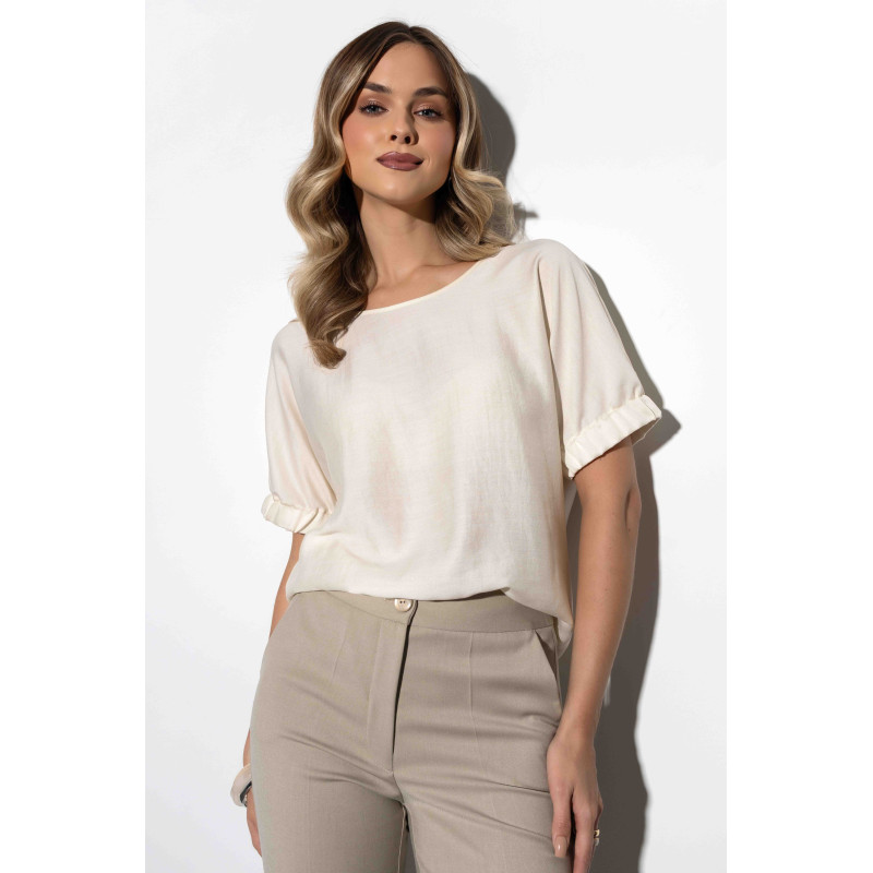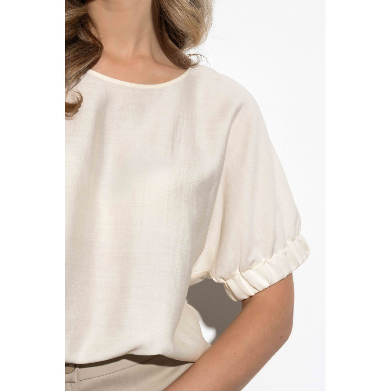 Bluzka ma luźny fason, dzięki czemu świetnie układa się na każdej figurze, subtelnie maskując drobne niedoskonałości i podkreślając kobiece atuty. To doskonały wybór zarówno do biura, jak i na wyjątkowe okazje, spotkania towarzyskie czy wieczorne wyjścia. Dostępna w kolorze delikatnego kremu.