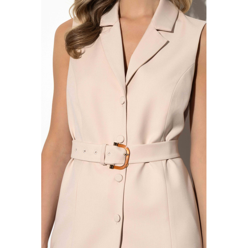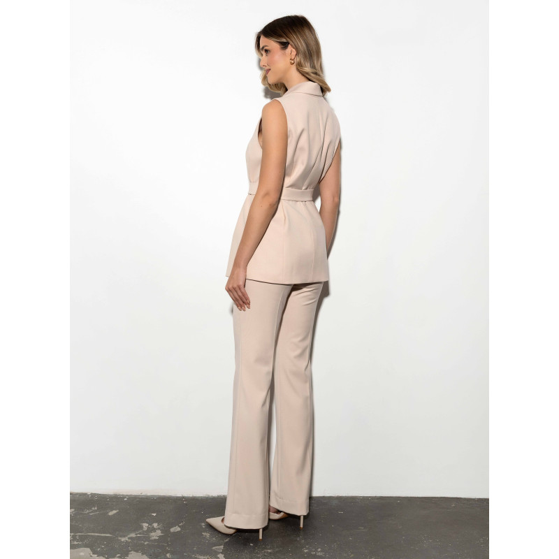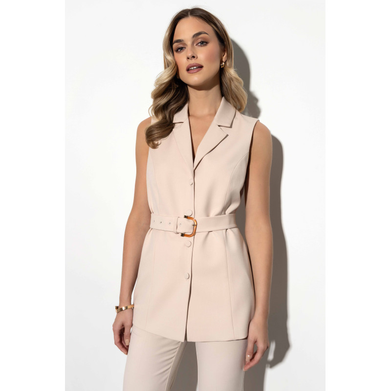 Kamizelka została zaprojektowana z myślą o wygodzie i kobiecym stylu. Z przodu zapinana jest na guziki, co pozwala na idealne dopasowanie do sylwetki oraz dodaje jej klasycznego, ponadczasowego wyglądu. W komplecie znajduje się pasek z tej samej tkaniny, który umożliwia podkreślenie talii i nadanie stylizacji bardziej kobiecego wyrazu.