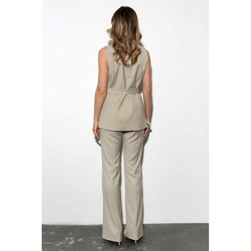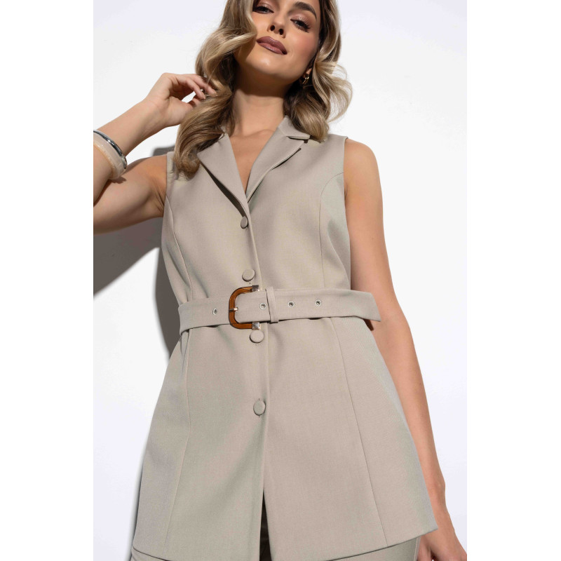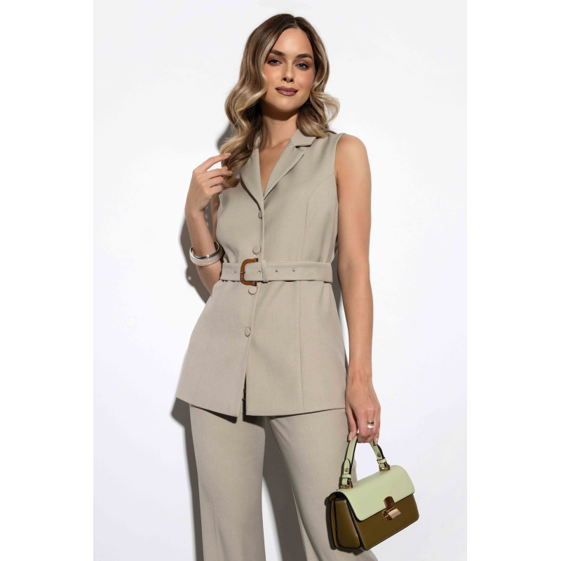 Kamizelka została zaprojektowana z myślą o wygodzie i kobiecym stylu. Z przodu zapinana jest na guziki, co pozwala na idealne dopasowanie do sylwetki oraz dodaje jej klasycznego, ponadczasowego wyglądu. W komplecie znajduje się pasek z tej samej tkaniny, który umożliwia podkreślenie talii i nadanie stylizacji bardziej kobiecego wyrazu.