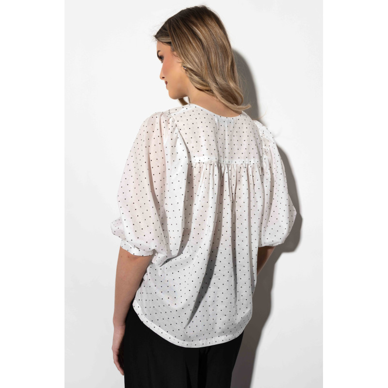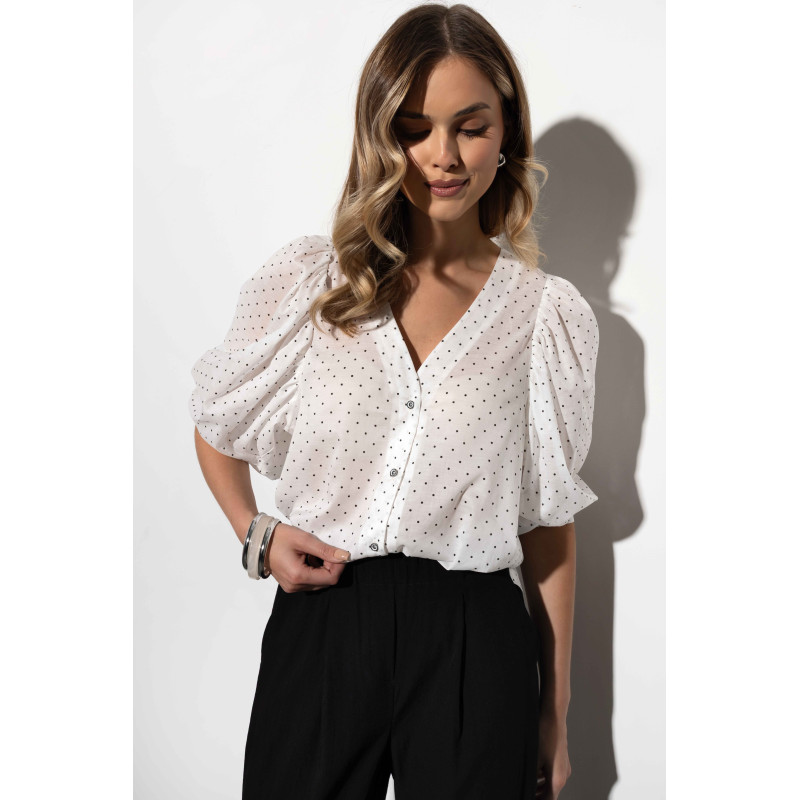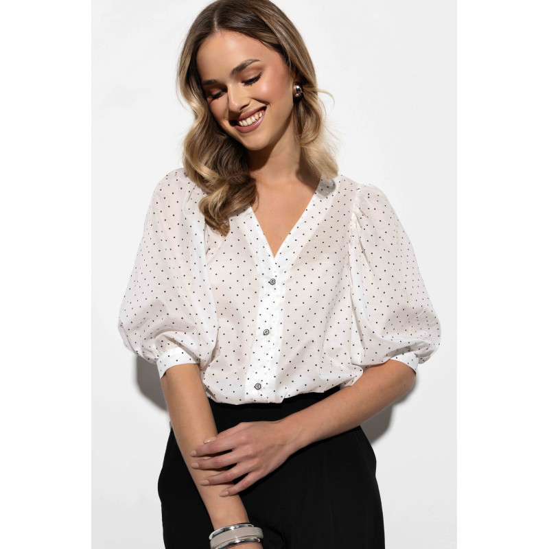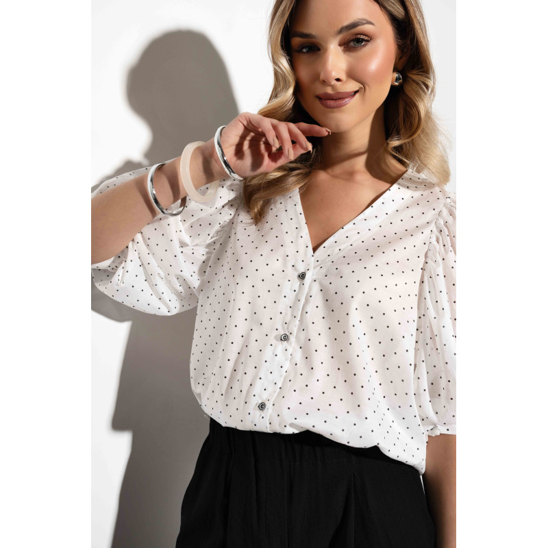 Koszula wyróżnia się uroczym wzorem w kropki, który nadaje jej lekkości i kobiecego charakteru. Luźny, pudełkowy fason zapewnia swobodę ruchów i nowoczesny wygląd. To doskonały wybór dla kobiet, które lubią stylizacje łączące elegancję z nutą casualowego luzu.