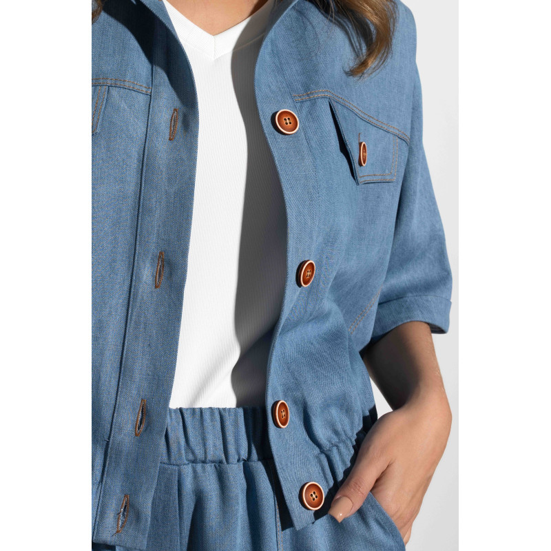 Kurtka jest zapinana z przodu na guziki, co nadaje całości klasycznego, jeansowego charakteru. Dodatkowym atutem są liczne przeszycia wykonane kontrastową nitką, które podkreślają fason i dodają całości wyjątkowego stylu. Ten detal sprawia, że kurtka wyróżnia się spośród standardowych modeli i świetnie komponuje się z wieloma stylizacjami – od casualowych po bardziej eleganckie.