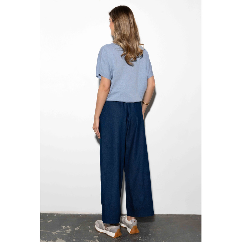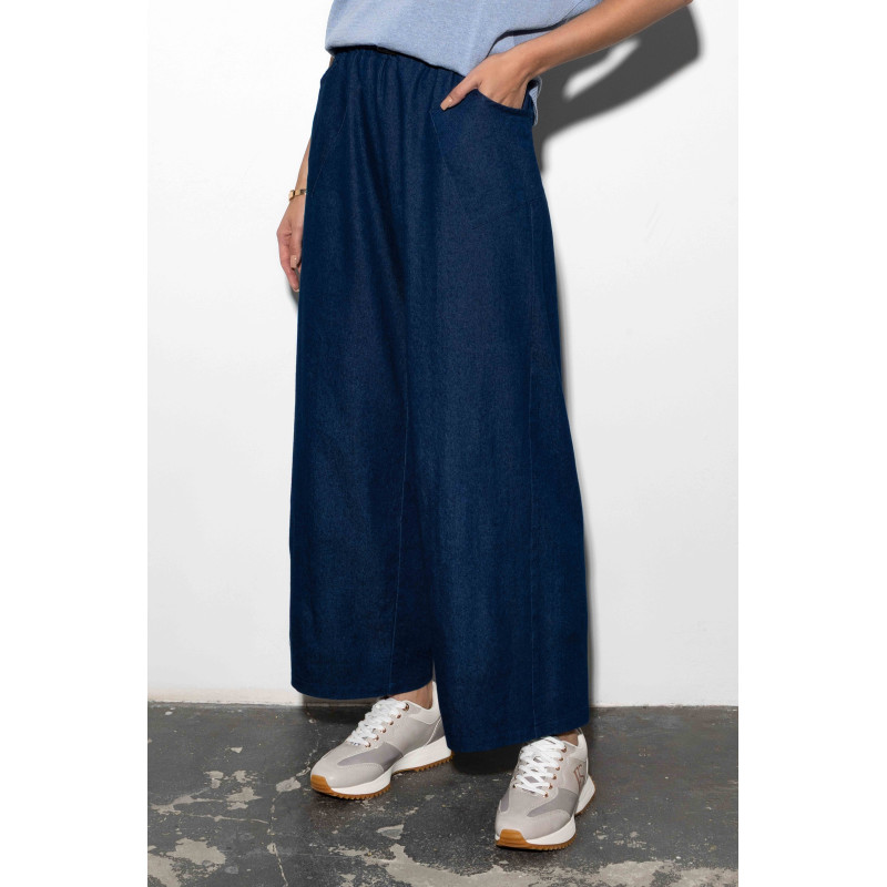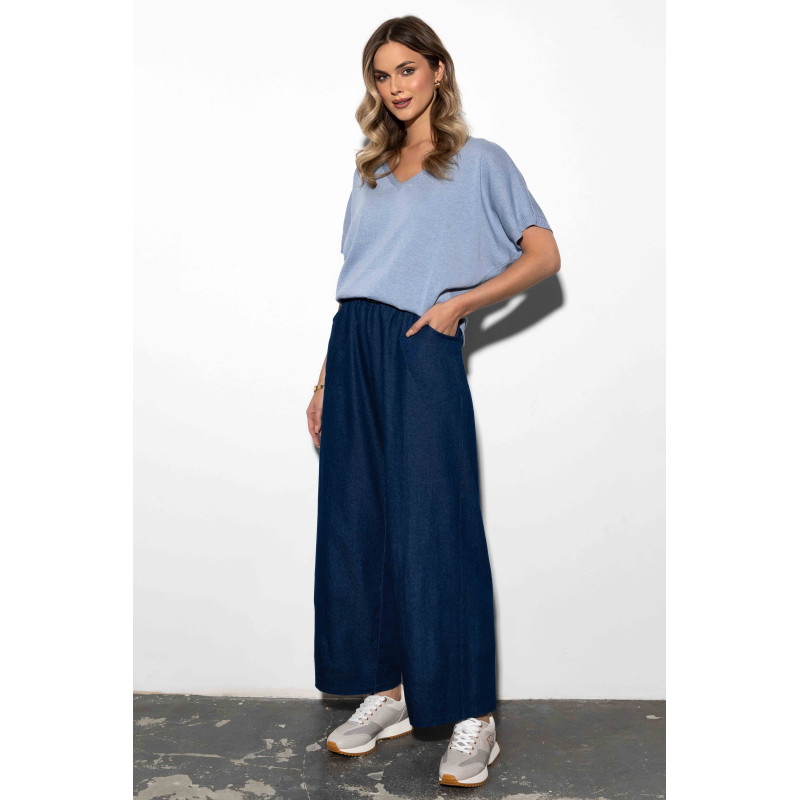Model charakteryzuje się szerokimi nogawkami, które nadają sylwetce lekkości i nowoczesnego wyglądu. Wysoki stan subtelnie podkreśla talię i optycznie wydłuża nogi, co sprawia, że spodnie prezentują się wyjątkowo elegancko i kobieco.
