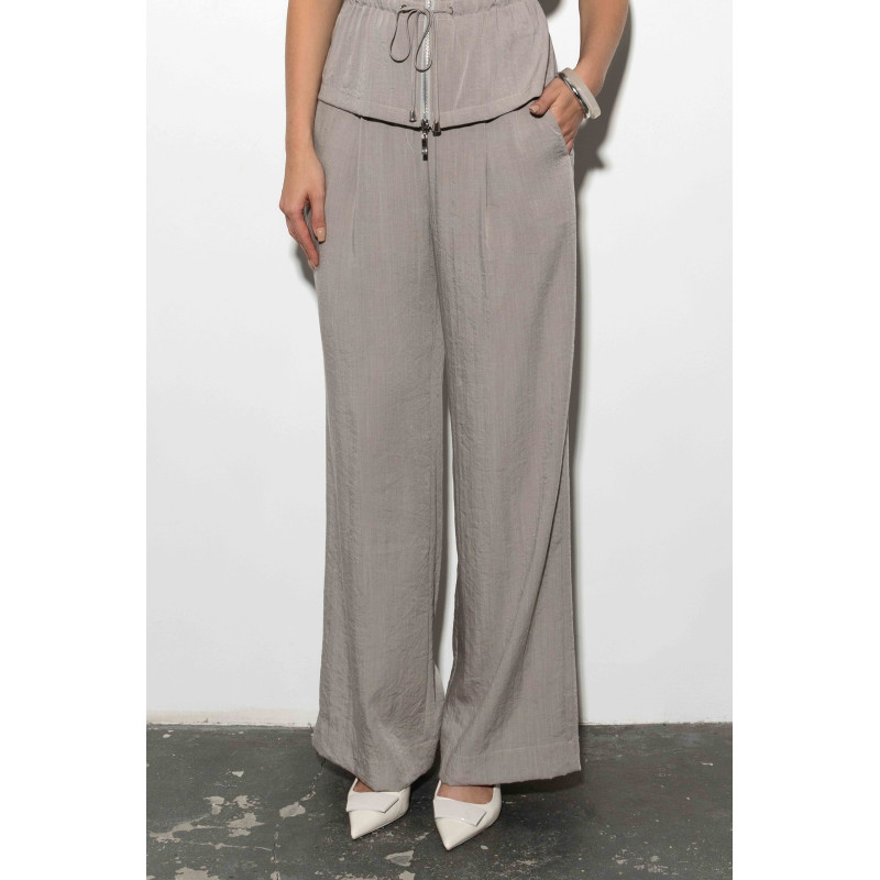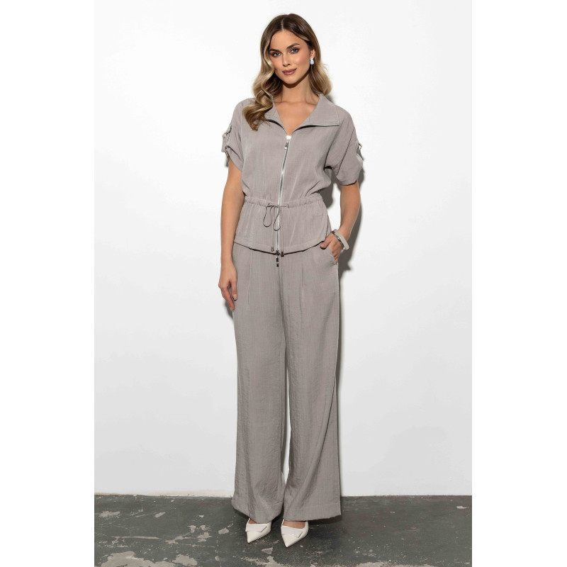 Model ma luźny fason z szerokimi nogawkami, który dodaje sylwetce lekkości. Taki krój zapewnia nie tylko maksymalną wygodę, ale również wpisuje się w aktualne trendy – to połączenie klasyki i nowoczesnego minimalizmu. W pasie znajduje się elastyczna guma, która dopasowuje się do figury i gwarantuje pełen komfort noszenia, jednocześnie zachowując estetyczny wygląd. Dla większej funkcjonalności spodnie są zapinane z boku na kryty zamek, co pozwala na wygodne zakładanie i zdejmowanie. Nie zabrakło również kieszeni, które zwiększają wygodę użytkowania i nadają spodniom codziennego charakteru. Model ten świetnie sprawdzi się w wielu stylizacjach – zarówno z lekką bluzką, jak i elegancką koszulą.