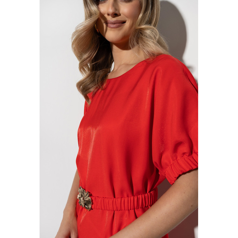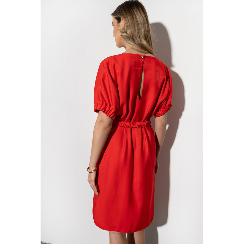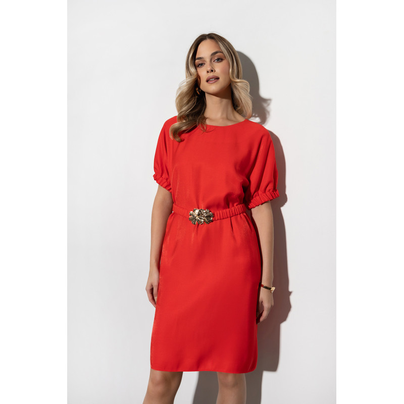 Model posiada krótki, szerszy rękaw zakończony gumką, który sprawia, że sukienka jest wygodna w noszeniu, a rękawy nie krępują ruchów. Pasek z ozdobną klamrą w komplecie pozwala dopasować sukienkę do sylwetki i podkreślić talię.