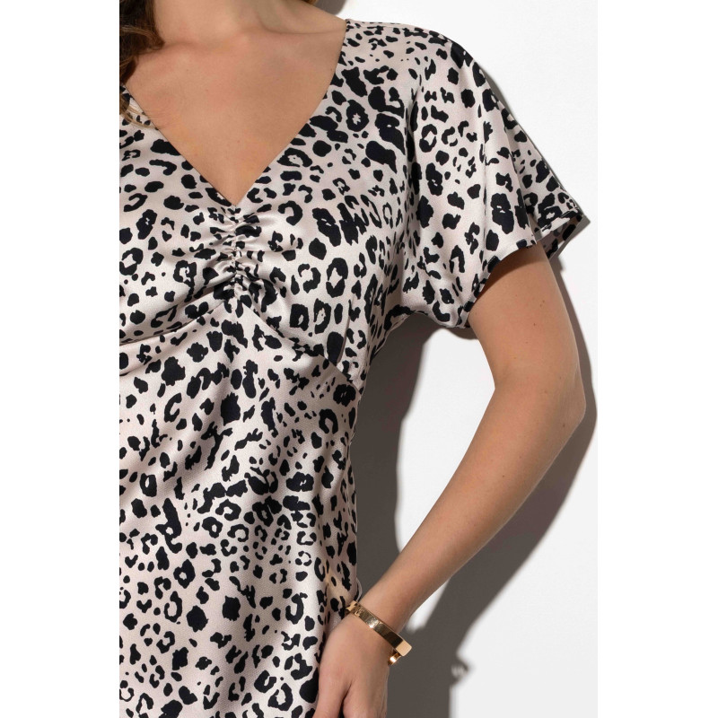 Sukienka została wykonana z tkaniny w beżowo-czarny, zwierzęcy wzór o satynowym wykończeniu, który nadaje całości subtelnego połysku i eleganckiego charakteru.