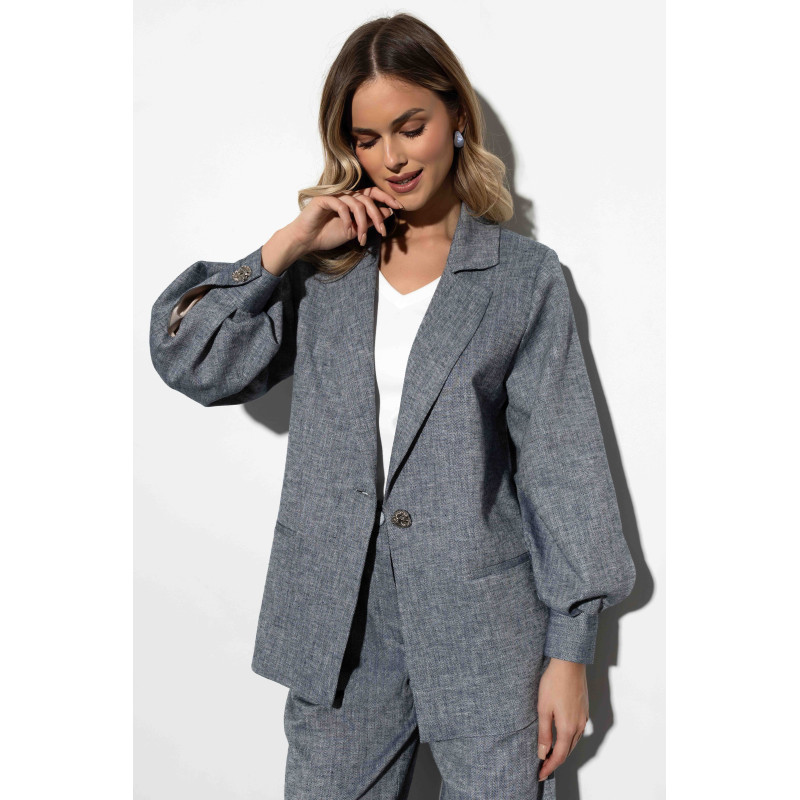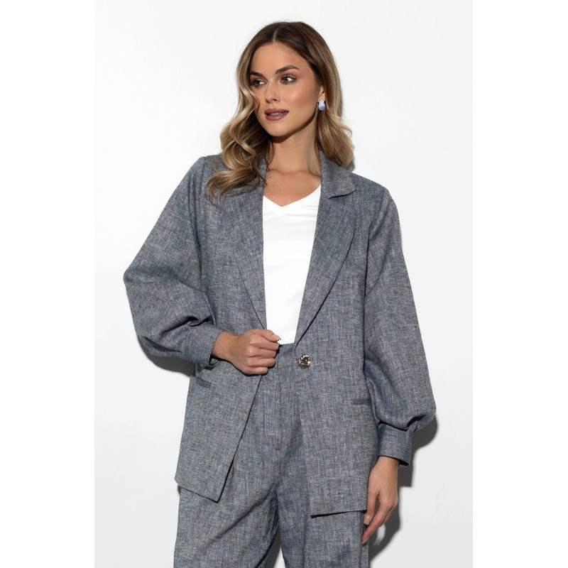 Długi, obszerny rękaw z marszczeniem to kobiecy akcent, który nadaje całości subtelnego, nowoczesnego charakteru. Marynarka na także praktyczne kieszenie, które dodają jej funkcjonalności i stylu.
