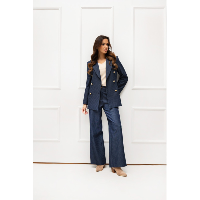 Odkryj wyjątkowe połączenie elegancji i nowoczesnego stylu dzięki eleganckiemu i stylowemu garniturowi damskiemu, który został zaprojektowany z myślą o kobietach ceniących ponadczasową klasykę w nowoczesnym wydaniu. Garnitur wykonany jest z granatowej tkaniny w paski, która optycznie wysmukla sylwetkę i dodaje całości profesjonalnego, wyrafinowanego charakteru. To idealny wybór zarówno do pracy, na spotkania biznesowe, jak i na specjalne okazje, gdzie liczy się subtelna, kobieca elegancja.