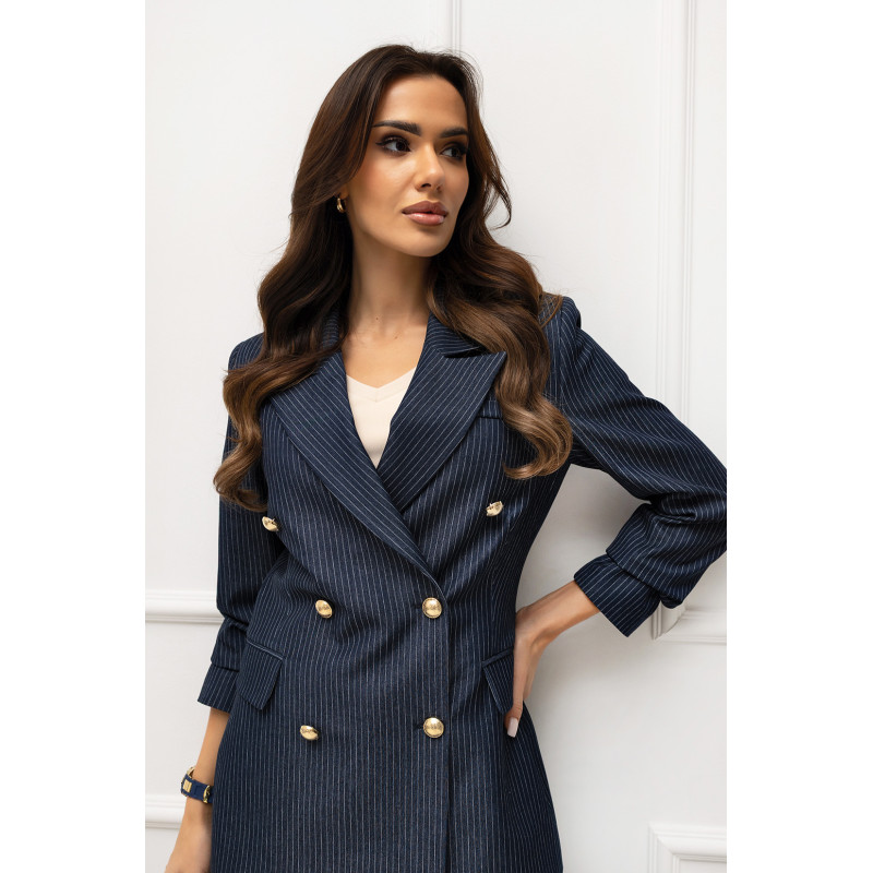 • Dwurzędowa, dłuższa marynarka, zapinana na ozdobne guziki