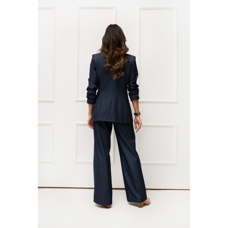 Ten granatowy garnitur w paski to propozycja dla kobiet, które lubią czuć się stylowo i pewnie siebie w każdej sytuacji. Harmonijnie łączy modową estetykę z wygodą, tworząc idealny zestaw do wielu okazji – od formalnych spotkań po wieczorne wyjścia. To doskonała inwestycja w garderobę, która pozostanie aktualna przez wiele sezonów i pozwoli tworzyć niezliczone, eleganckie stylizacje.