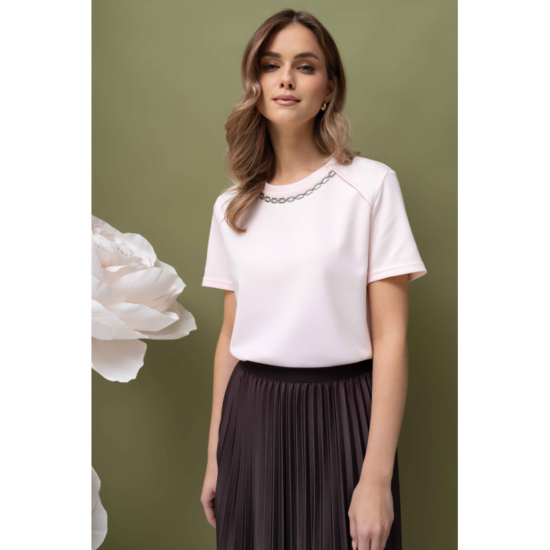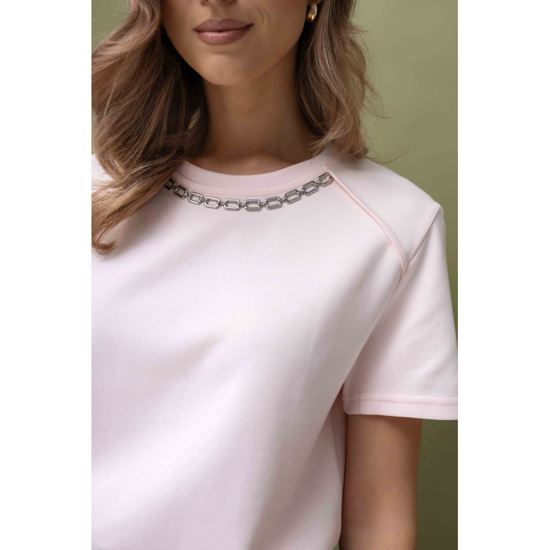 Jasnoróżowy t-shirt damski z ozdobą w dekolcie