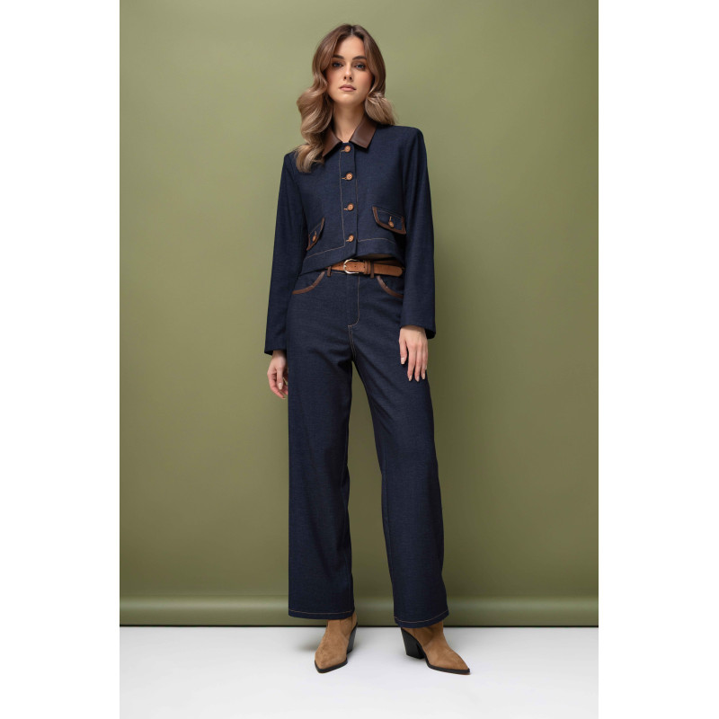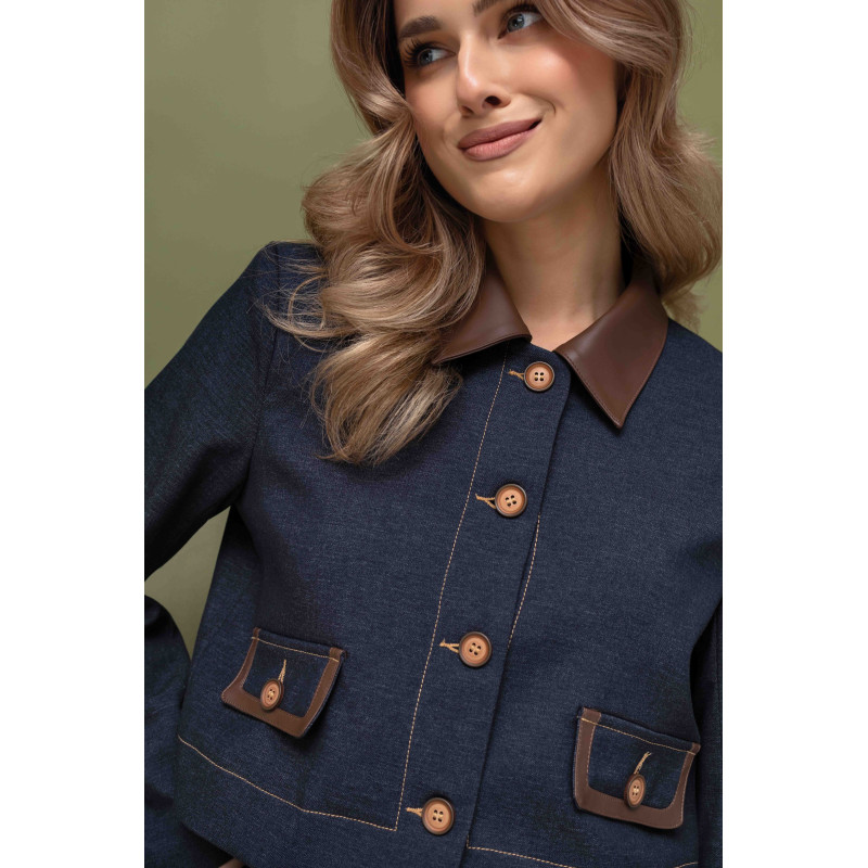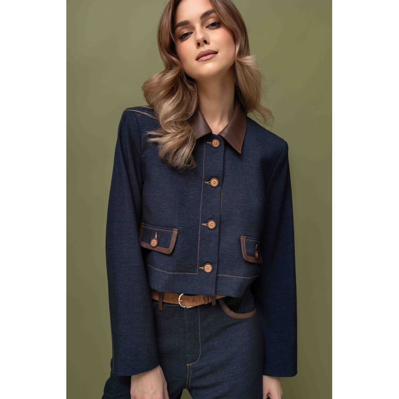 Krótka marynarka o pudełkowym fasonie, zapinana z przodu na guziki, podkreśla nowoczesną linię sylwetki i nadaje stylizacji wyrazistej formy. Kołnierz oraz patki wykończone eko-skórą wprowadzają elegancki kontrast i luksusowy akcent, który idealnie współgra z granatową tkaniną. Dodatkowo marynarka została wykończona podszewką, co zapewnia wygodę użytkowania oraz estetyczne wykończenie.