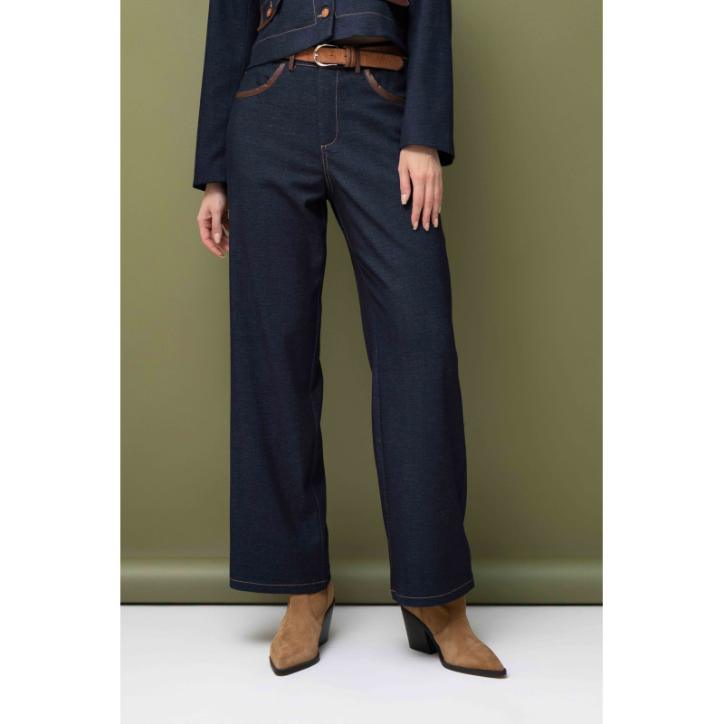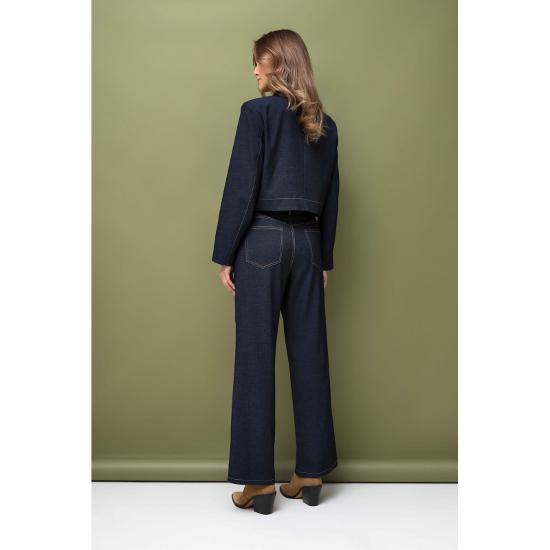 Uzupełnieniem zestawu są spodnie z szeroką nogawką, które nadają całości lekkości i elegancji. Model jest zapinany na zamek i guzik, co gwarantuje komfort oraz stabilne dopasowanie. Kieszenie oraz szlufki wykończone eko-skórą stanowią spójne nawiązanie do detali marynarki, podkreślając dopracowany charakter kompletu.