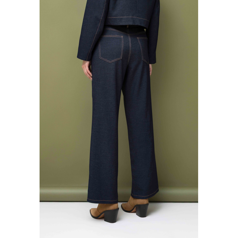 Komplet został wykonany z granatowej tkaniny o jeansowej fakturze, która nadaje całości elegancki, szlachetny charakter. Głęboki odcień granatu został dodatkowo podkreślony poprzez przeszycia kontrastową, rudą nitką, tworzące efektowny akcent wizualny i nadające zestawowi nowoczesnego wyrazu. Ten detal wyróżnia komplet na tle klasycznych propozycji, nadając mu modowego charakteru.