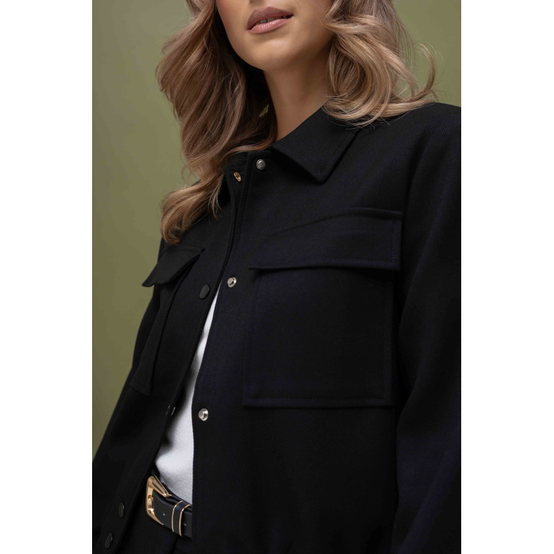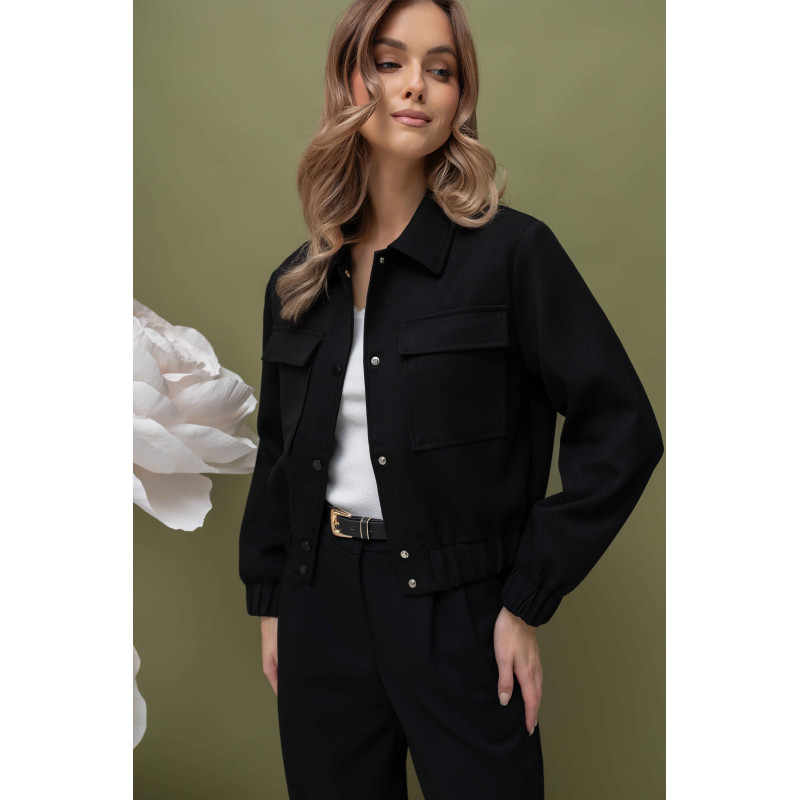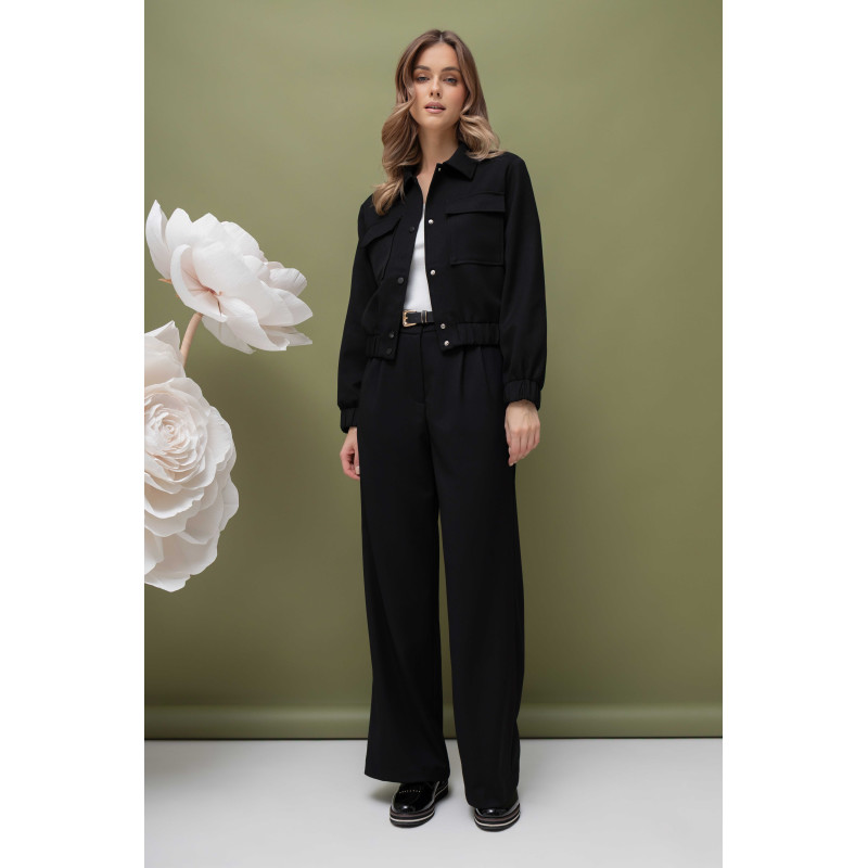 Komplet został wykonany z tkaniny o wyraźnej strukturze, co nadaje mu charakteru i sprawia, że materiał jest trwały, odporny na zagniecenia i przyjemny w dotyku. Struktura tkaniny podkreśla nowoczesny styl kompletu, a jednocześnie dodaje mu subtelnej elegancji. Kurtka typu bomberka zapinana jest na napy, co ułatwia szybkie zakładanie i zdejmowanie, a minimalistyczne zapięcie świetnie komponuje się z casualowym charakterem stroju.