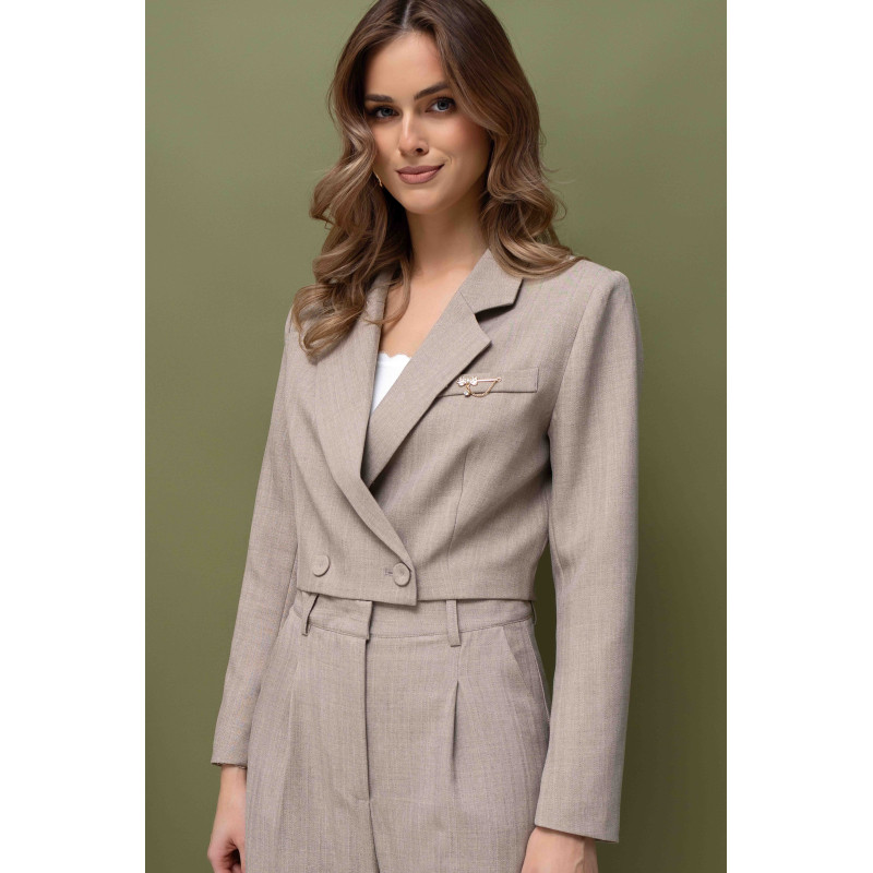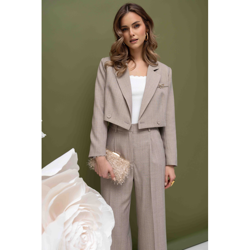Elegancki, beżowy garnitur damski z krótką marynarką