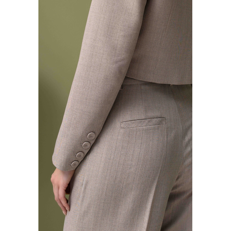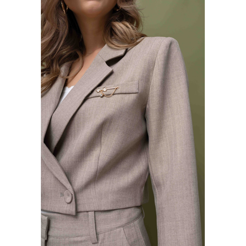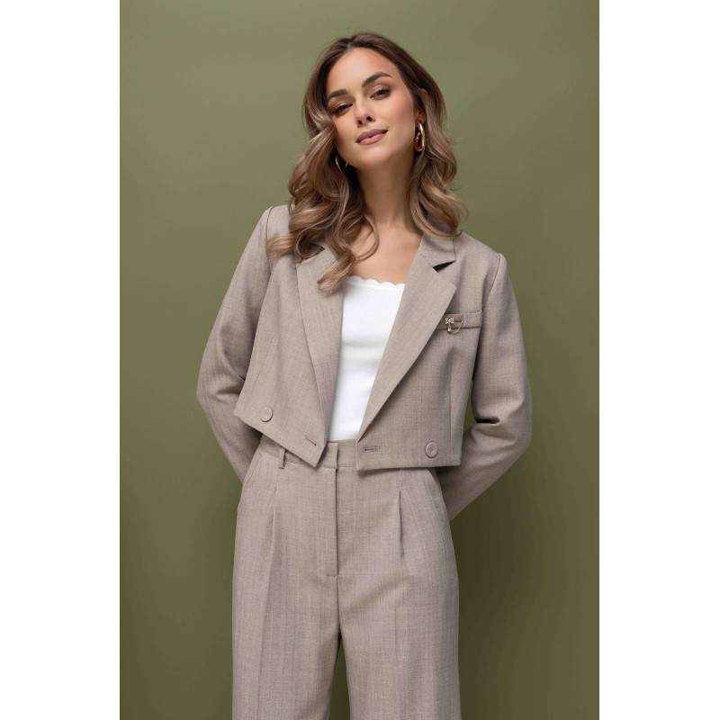 Stylowym detalem jest ozdobna broszka umieszczona na patce, która dodaje marynarce wyrafinowanego, biżuteryjnego akcentu i podkreśla elegancki charakter garnituru. Długie rękawy nadają marynarce klasyczny wygląd, a podszewka zapewnia komfort noszenia oraz przewiewność, nawet podczas długiego dnia.