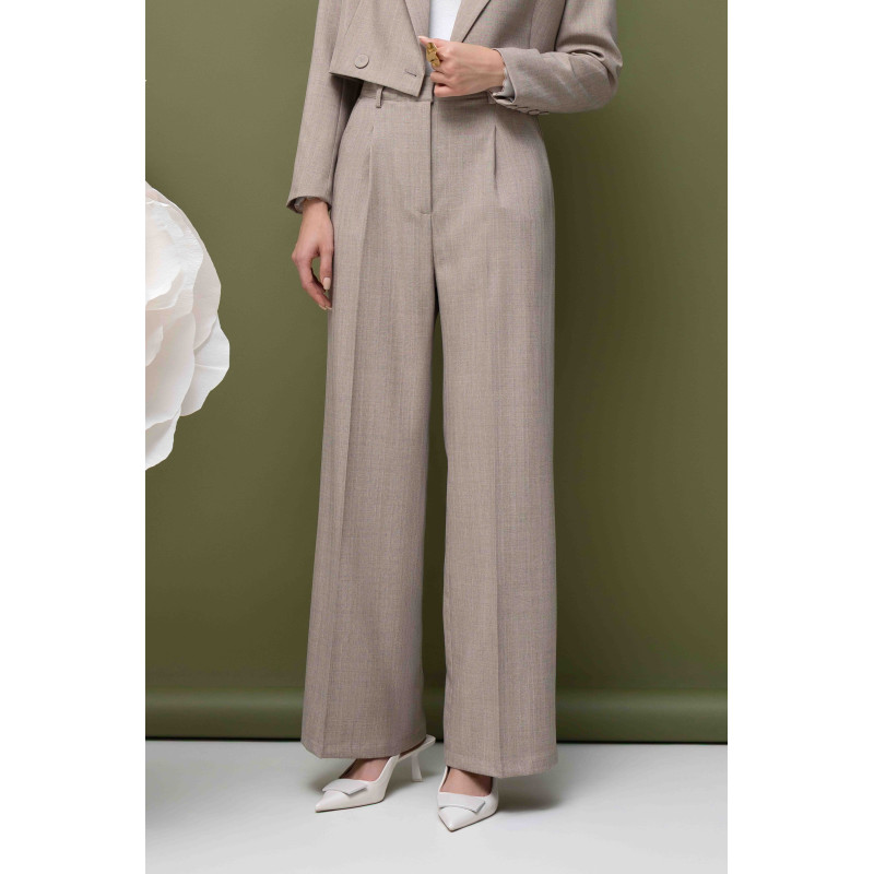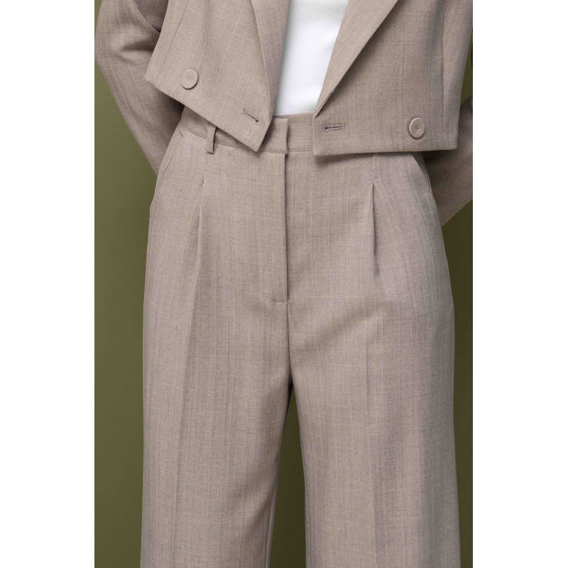 Spodnie damskie z szerokimi nogawkami w kant doskonale uzupełniają marynarkę, tworząc spójną i harmonijną całość. Klasyczny kant optycznie wydłuża nogi i podkreśla elegancki styl spodni. Model jest zapinany na zamek, guzik oraz haftkę, co gwarantuje idealne dopasowanie i wygodę użytkowania. Dodatkowo praktyczne kieszenie zwiększają funkcjonalność kompletu.