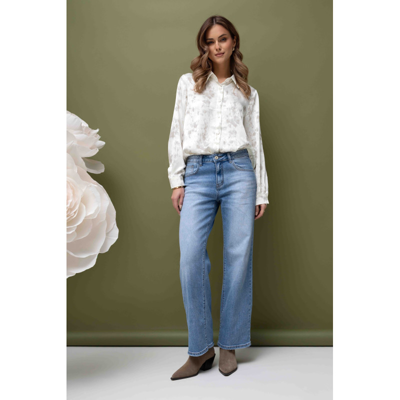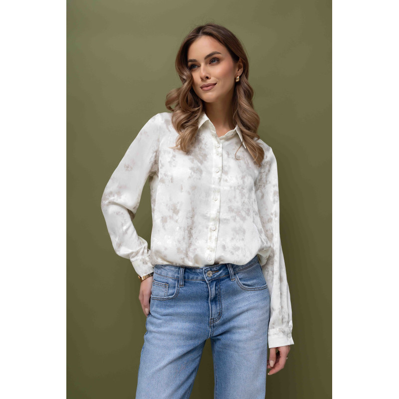 Koszula została wykonana ze zwiewnej, wzorzystej tkaniny o satynowym wykończeniu, co nadaje jej lekkości i subtelnego połysku. Materiał delikatnie układa się na sylwetce, zapewniając komfort przez cały dzień, a eleganckie wykończenie satyny podkreśla kobiecy charakter koszuli. Dodatkowo, na tkaninie znajdują się subtelne wytłoczenia, które nadają koszuli unikalnego charakteru i dodają wizualnej lekkości.
