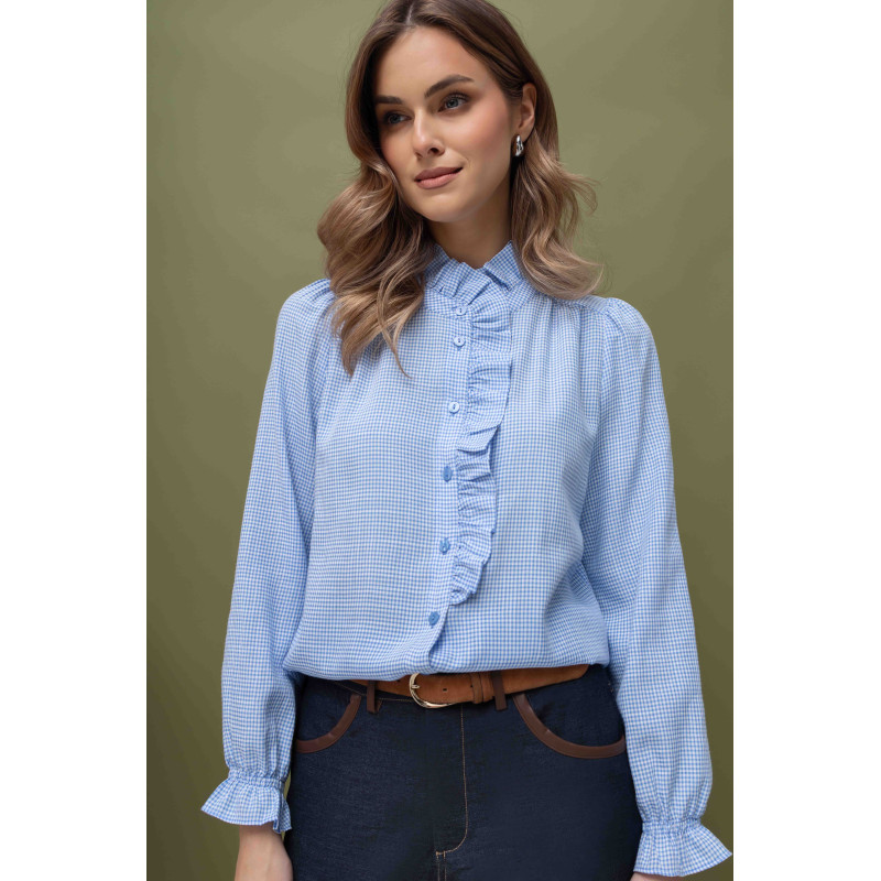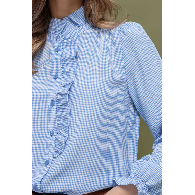 Koszula zapinana jest z przodu na klasyczne guziki, co podkreśla jej ponadczasowy charakter i funkcjonalność. Wyjątkowym elementem tego modelu jest ozdobna falbana umieszczona wzdłuż stójki oraz na przodzie koszuli, która nadaje stylizacji romantycznego i eleganckiego akcentu. Dekolt pięknie eksponuje szyję, jednocześnie zachowując klasę i subtelność.