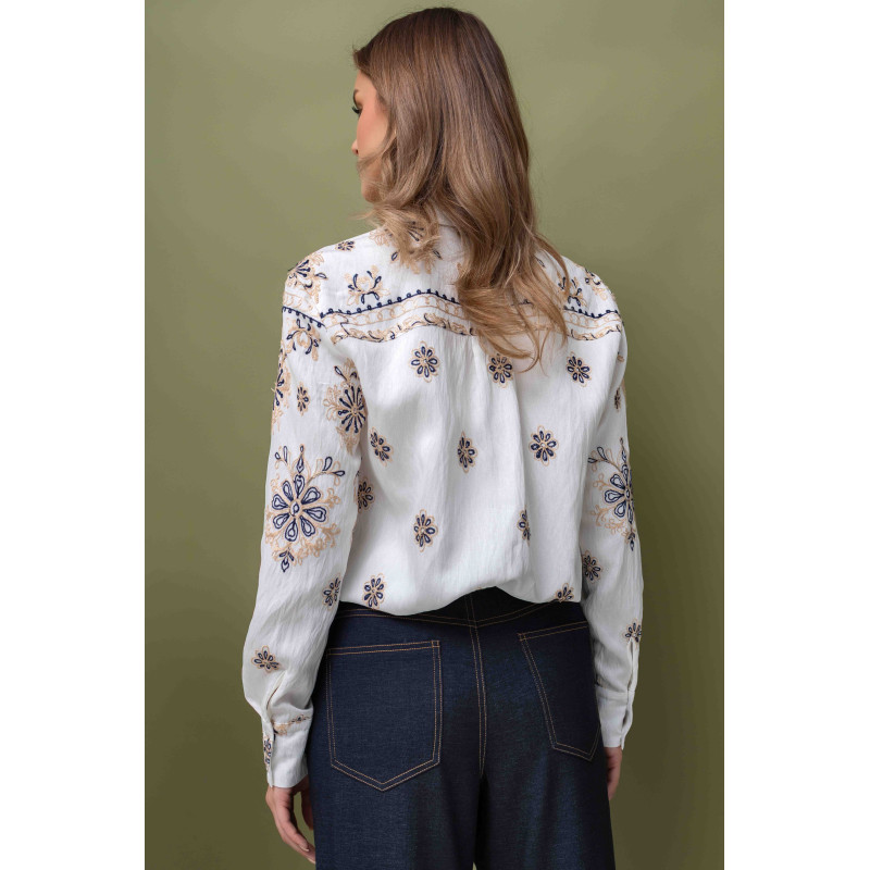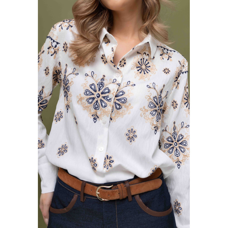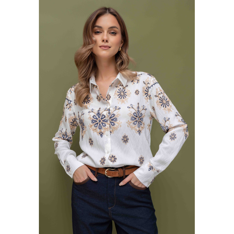 Kremowa, casualowa koszula z haftowanym wzorem