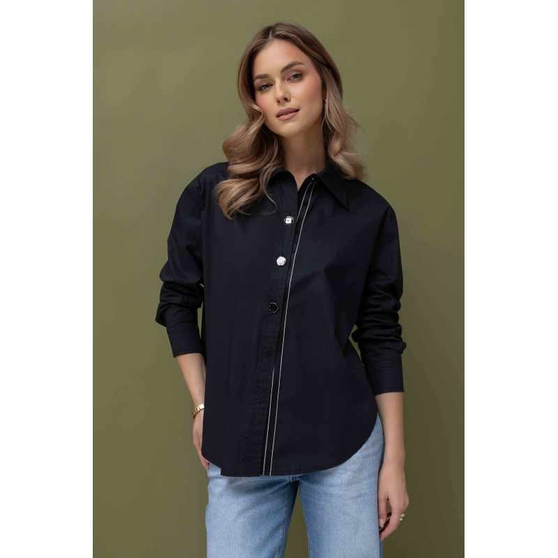 Czarna, bawełniana koszula damska z ozdobną tasiemką i kwiatowymi guzikami