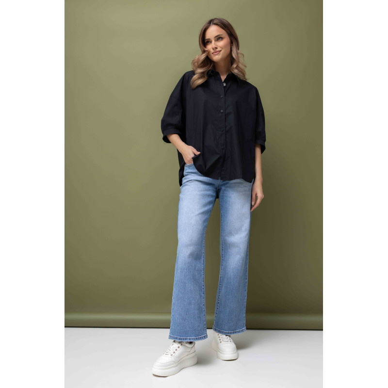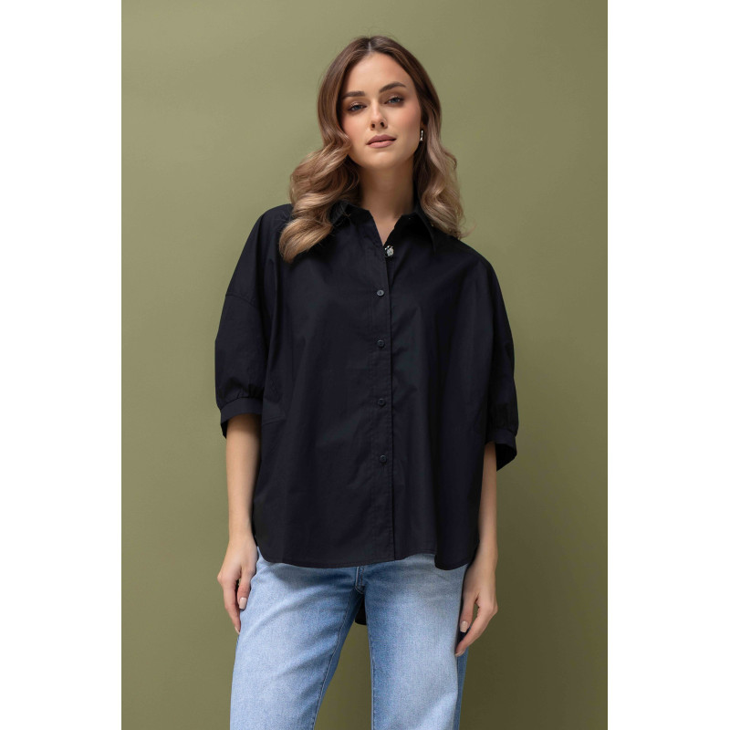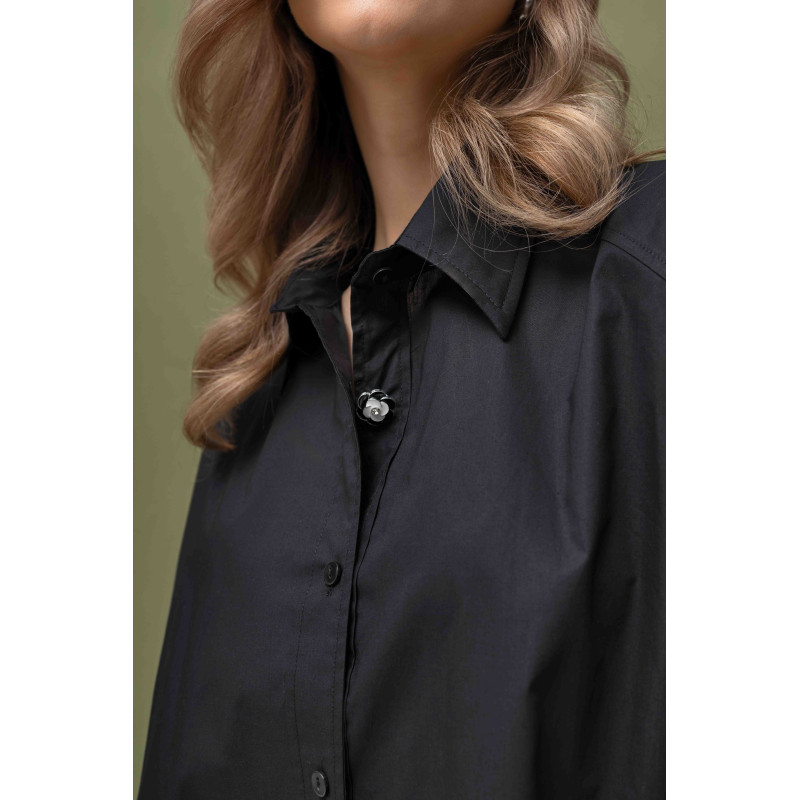 Koszula zapinana jest z przodu na guziki, co zwiększa jej funkcjonalność i pozwala nosić ją na wiele sposobów. Uniwersalna kolorystyka czerni sprawia, że koszula łatwo dopasuje się do spodni, szortów czy spódnic, tworząc stylowe i wygodne zestawy na co dzień.