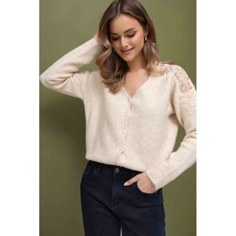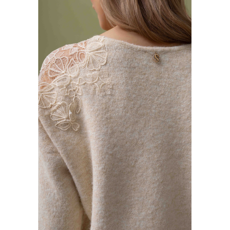 Wyjątkowym elementem dekoracyjnym jest ozdobna koronka na ramionach, która dodaje całości subtelnej kobiecości i oryginalności. Dekolt w serek pięknie podkreśla linię szyi i optycznie wysmukla sylwetkę.