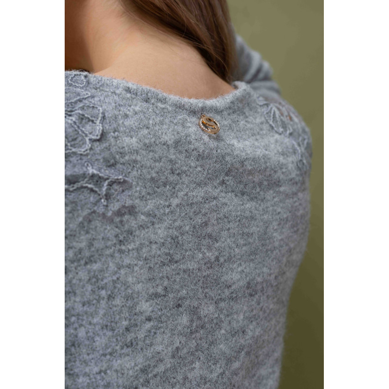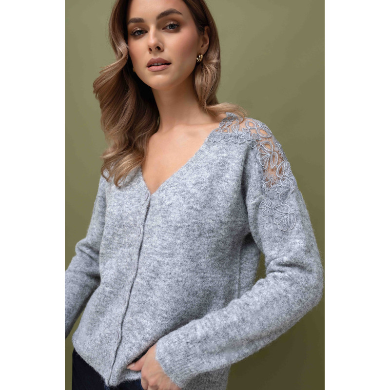 Szary sweter z koronką na ramionach