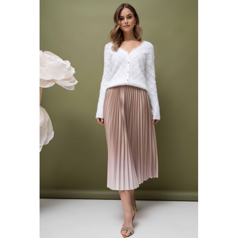 Na zdjęciu w zestawie z beżową, plisowaną spódnicą