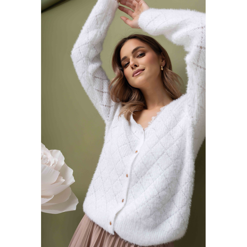 Biały, rozpinany sweter damski z ażurowym wzorem i ozdobną koronką