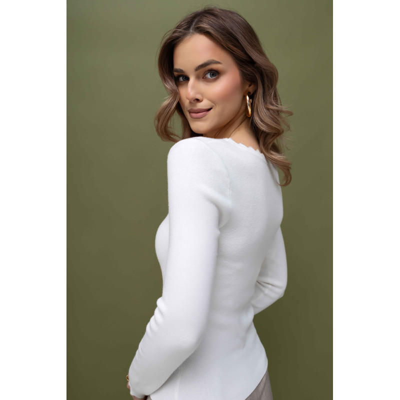 Wyjątkowym detalem są dekolt oraz rękawy wykończone połyskującą nitką, która dodaje swetrowi subtelnego blasku i elegancji. Ten drobny akcent sprawia, że sweter wyróżnia się na tle klasycznych modeli, zachowując jednocześnie minimalistyczny styl. To idealny wybór dla kobiet, które lubią klasykę z nutą nowoczesnego wyrafinowania.