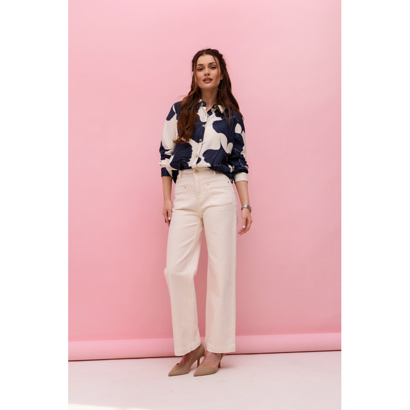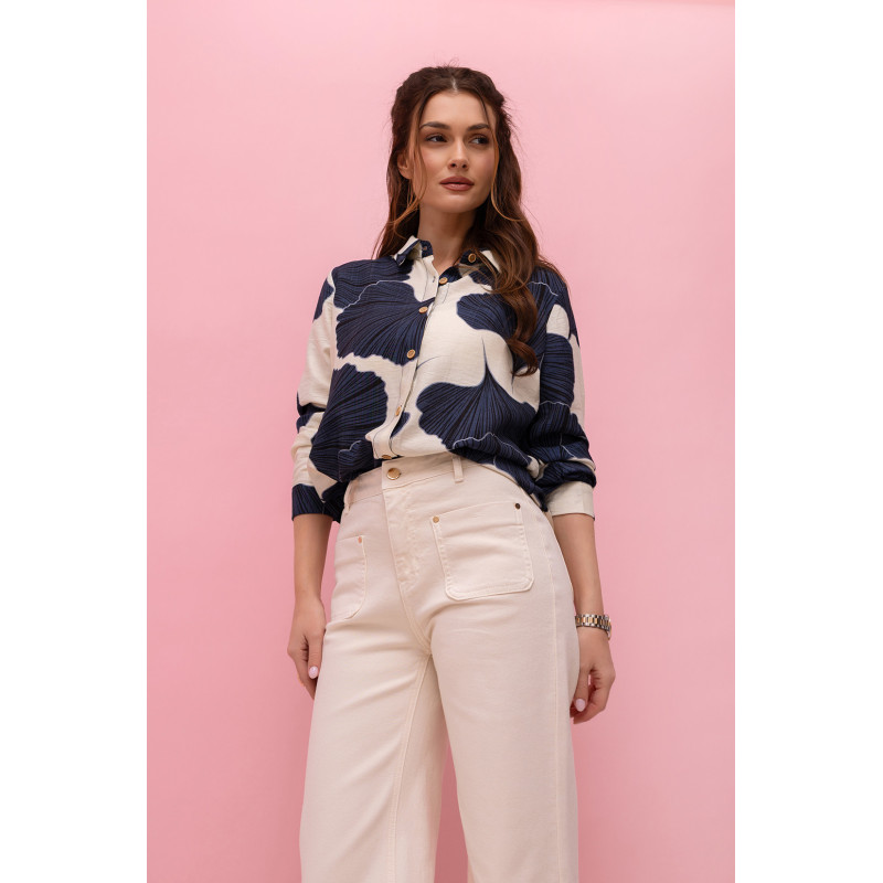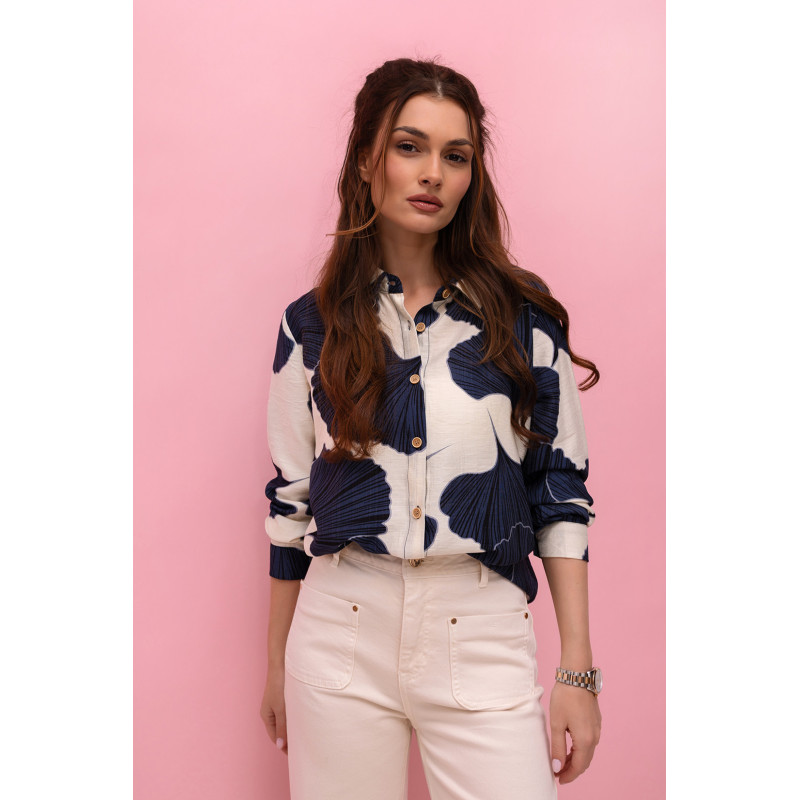 Model wyróżnia się kremowo-granatowym wzorem, który nadaje koszuli eleganckiego, a jednocześnie nowoczesnego charakteru. Dzięki stonowanej kolorystyce koszula jest bardzo uniwersalna i łatwa do stylizacji – można ją zestawić zarówno z jeansami, spodniami materiałowymi, jak i spódnicą.