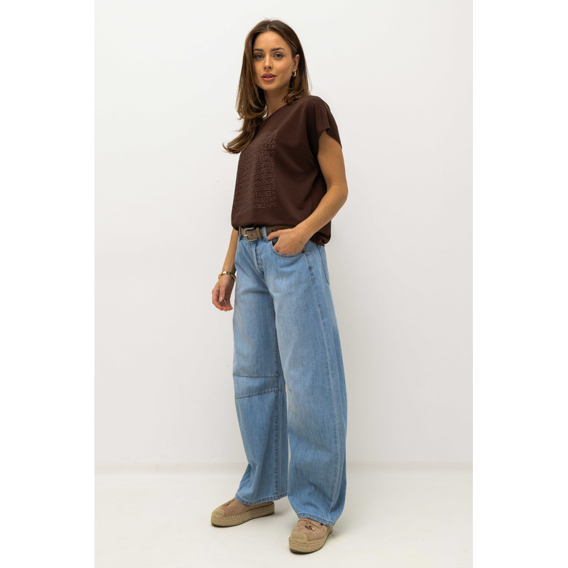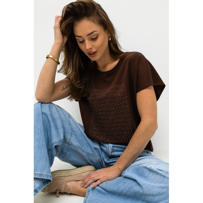 Z przodu uwagę przyciąga ozdobna aplikacja z napisami, która dodaje całości charakteru i nowoczesnego, miejskiego stylu. To modny detal, który przełamuje klasyczną formę, nadając bluzce niepowtarzalny wygląd. Dzięki niemu model świetnie wpisuje się w aktualne trendy casual chic, łącząc luz z elegancją.