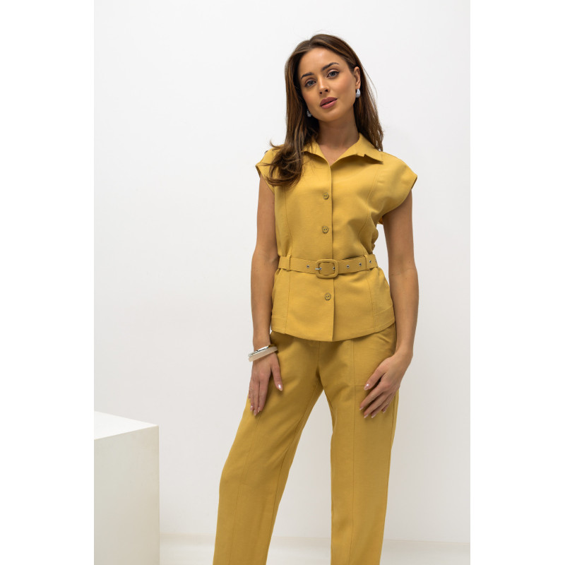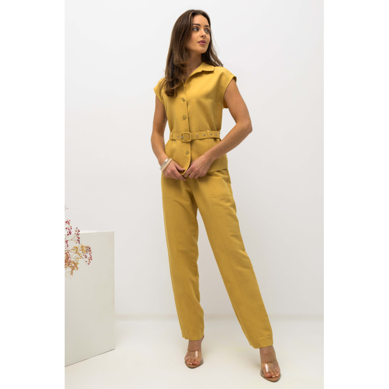 Kamizelka została wykonana z naturalnej wiskozowej tkaniny z dodatkiem bawełny, dzięki czemu jest przewiewna i wyjątkowo komfortowa w noszeniu. Przód modelu zdobią ozdobne guziki, które dodają elegancji i stanowią subtelny detal wyróżniający tę kamizelkę spośród innych. W komplecie znajduje się pasek z tej samej tkaniny, który pozwala na dodatkowe podkreślenie talii i stworzenie harmonijnej, dopasowanej stylizacji.