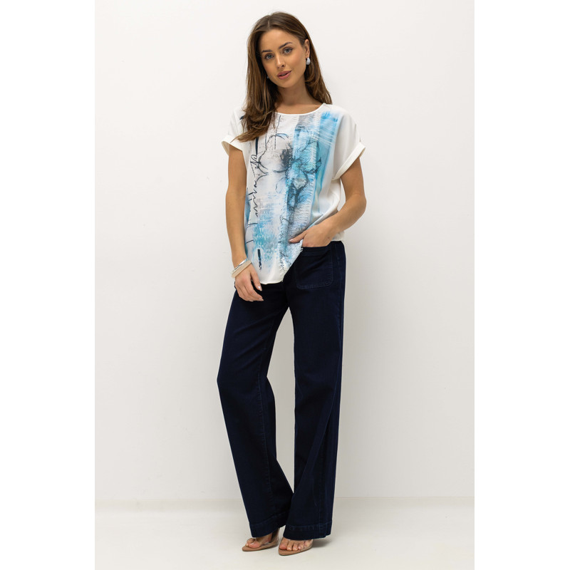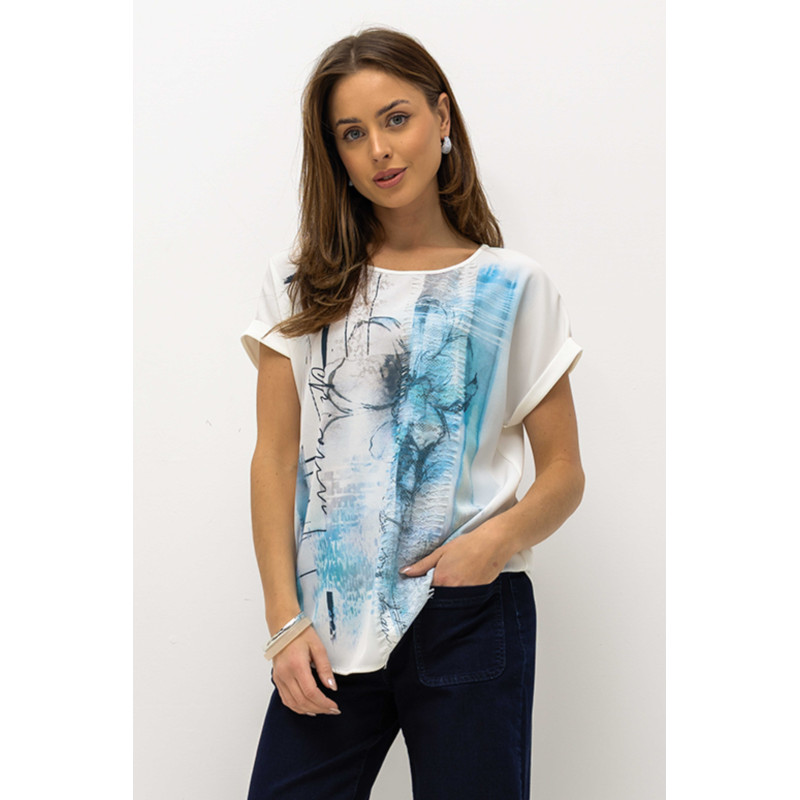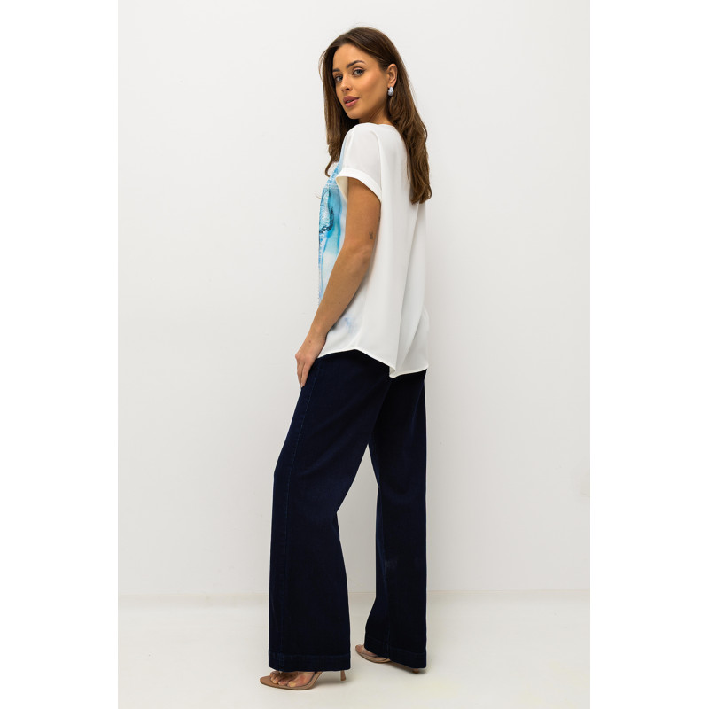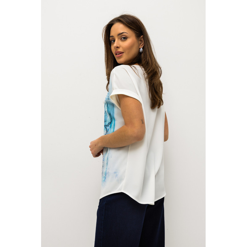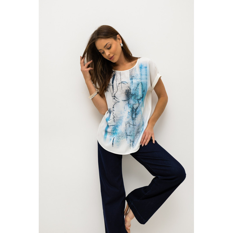 Bluzka posiada szerszy, luźny fason, który doskonale maskuje drobne niedoskonałości i zapewnia modny, casualowy wygląd. Z przodu znajduje się ozdobny nadruk w odcieniach niebieskiego, z delikatną aplikacją z koronki, nadający całości wyjątkowego charakteru i kobiecego uroku. Ten subtelny detal sprawia, że bluzka wyróżnia się spośród klasycznych modeli, zachowując przy tym elegancki ton.