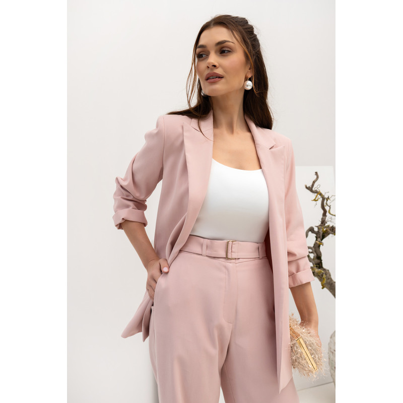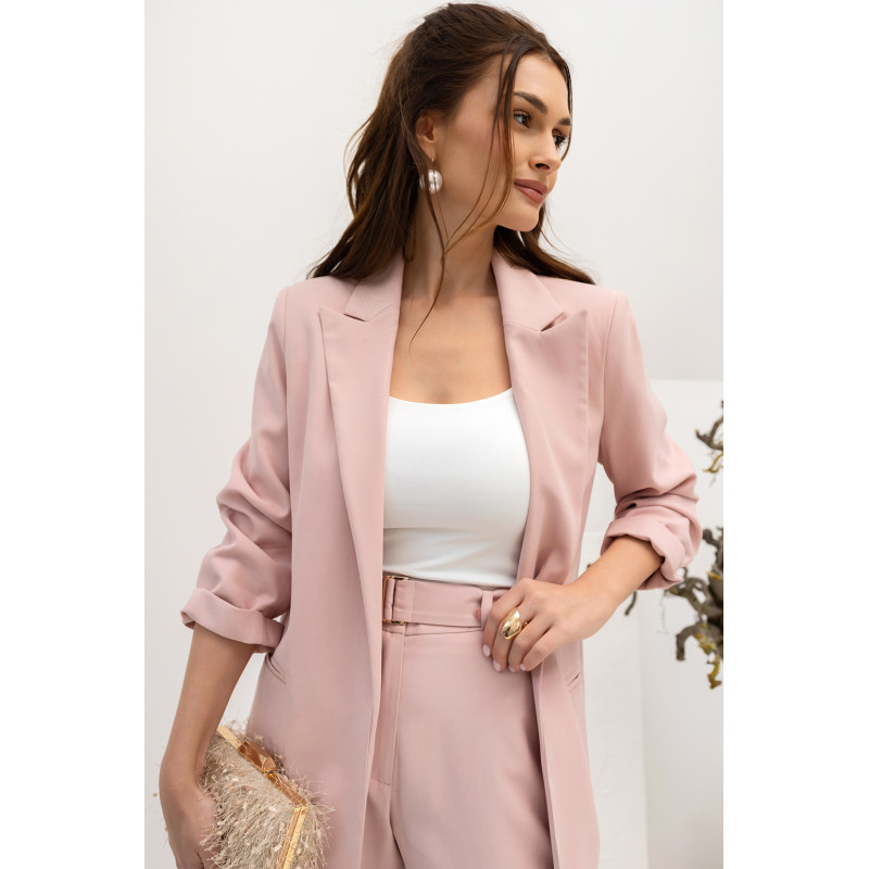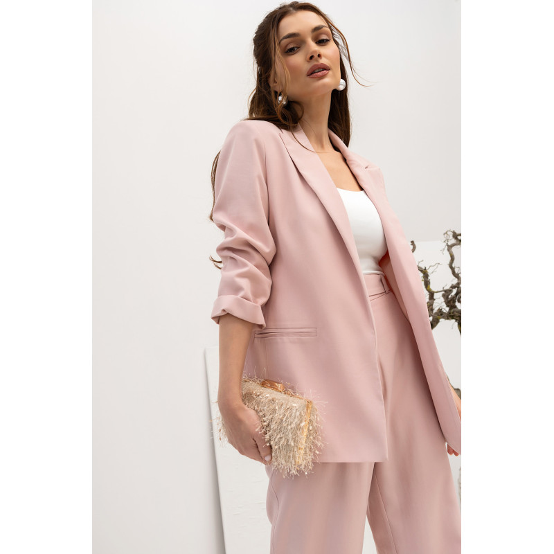 Marynarka ma luźny fason, który zapewnia swobodę ruchów i komfort noszenia, jednocześnie zachowując elegancki, kobiecy wygląd. Rękawy o długości 3/4 zakończone są ozdobnym podwinięciem, co nadaje całości lekkości i modnego charakteru.